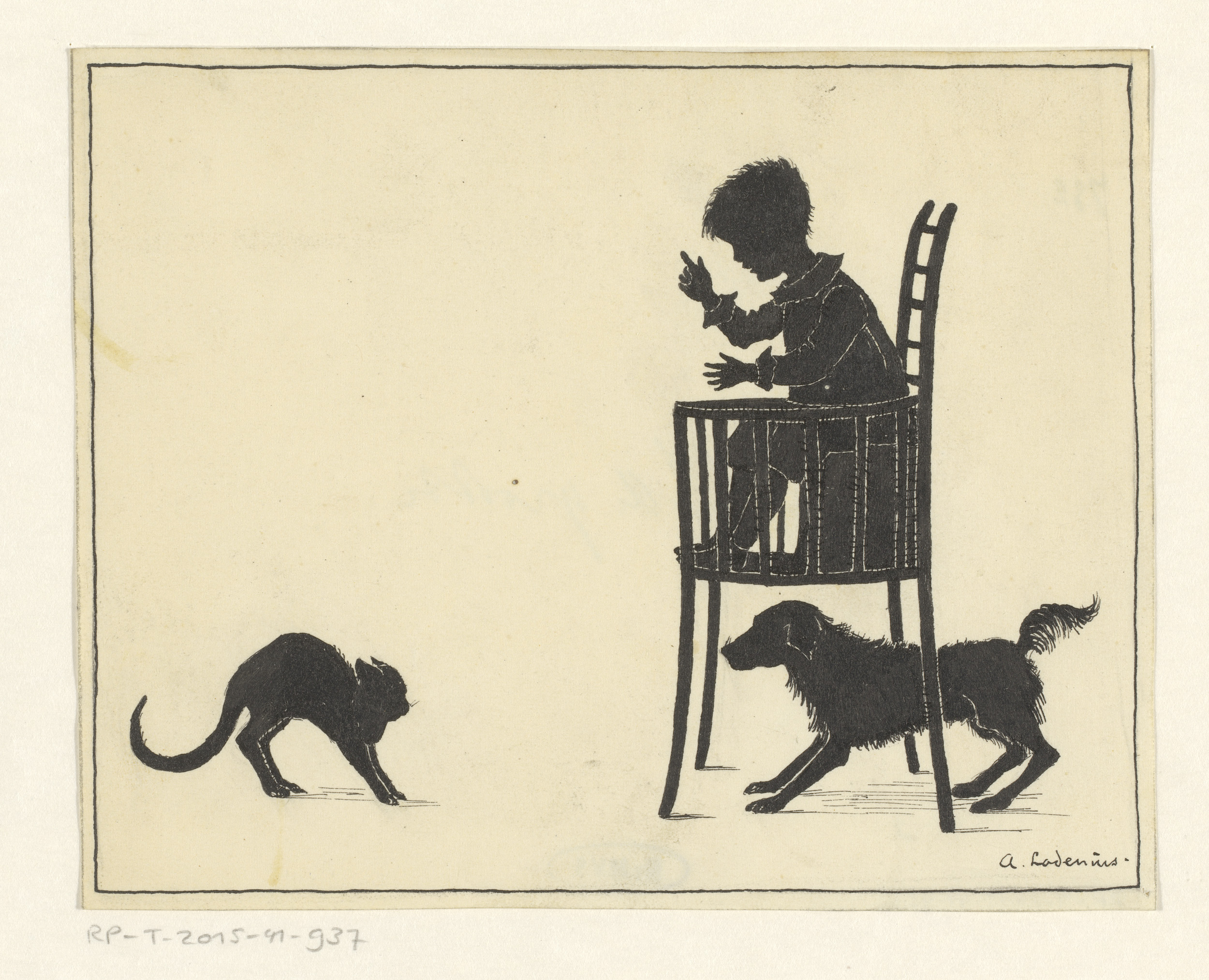 Kat en hond rond een kinderstoel