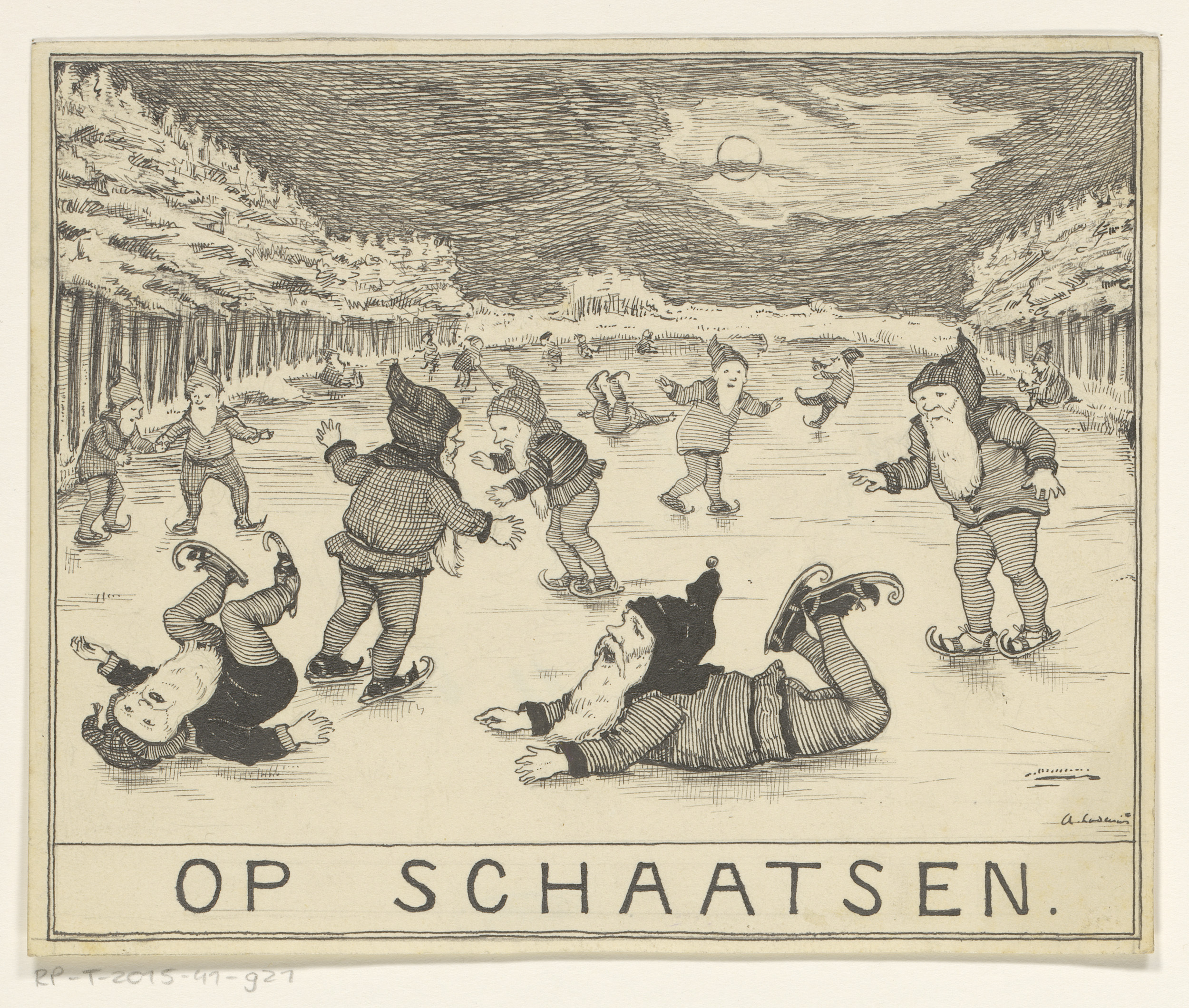Schaatsende kabouters bij maanlicht