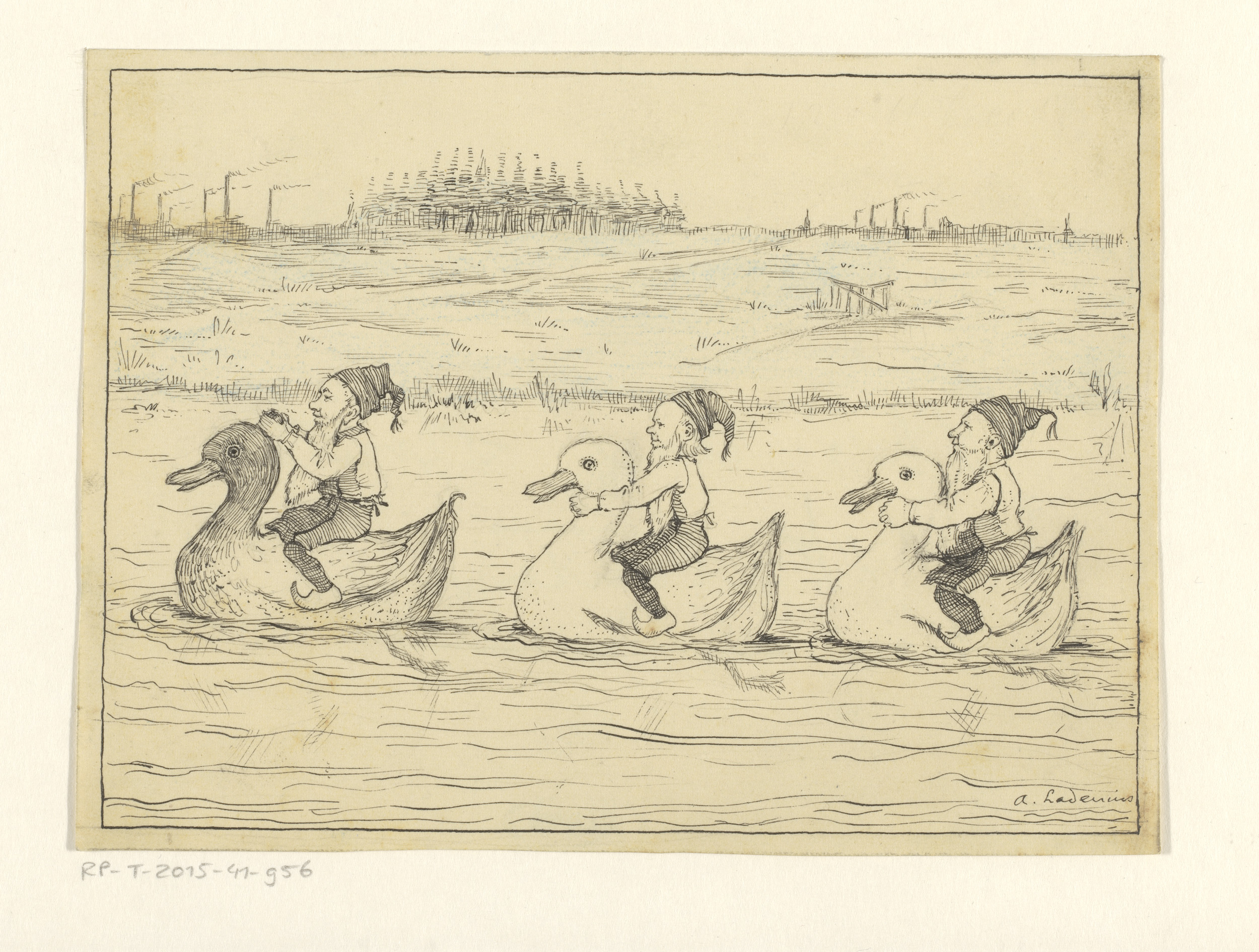 Drie kabouters varend op eenden