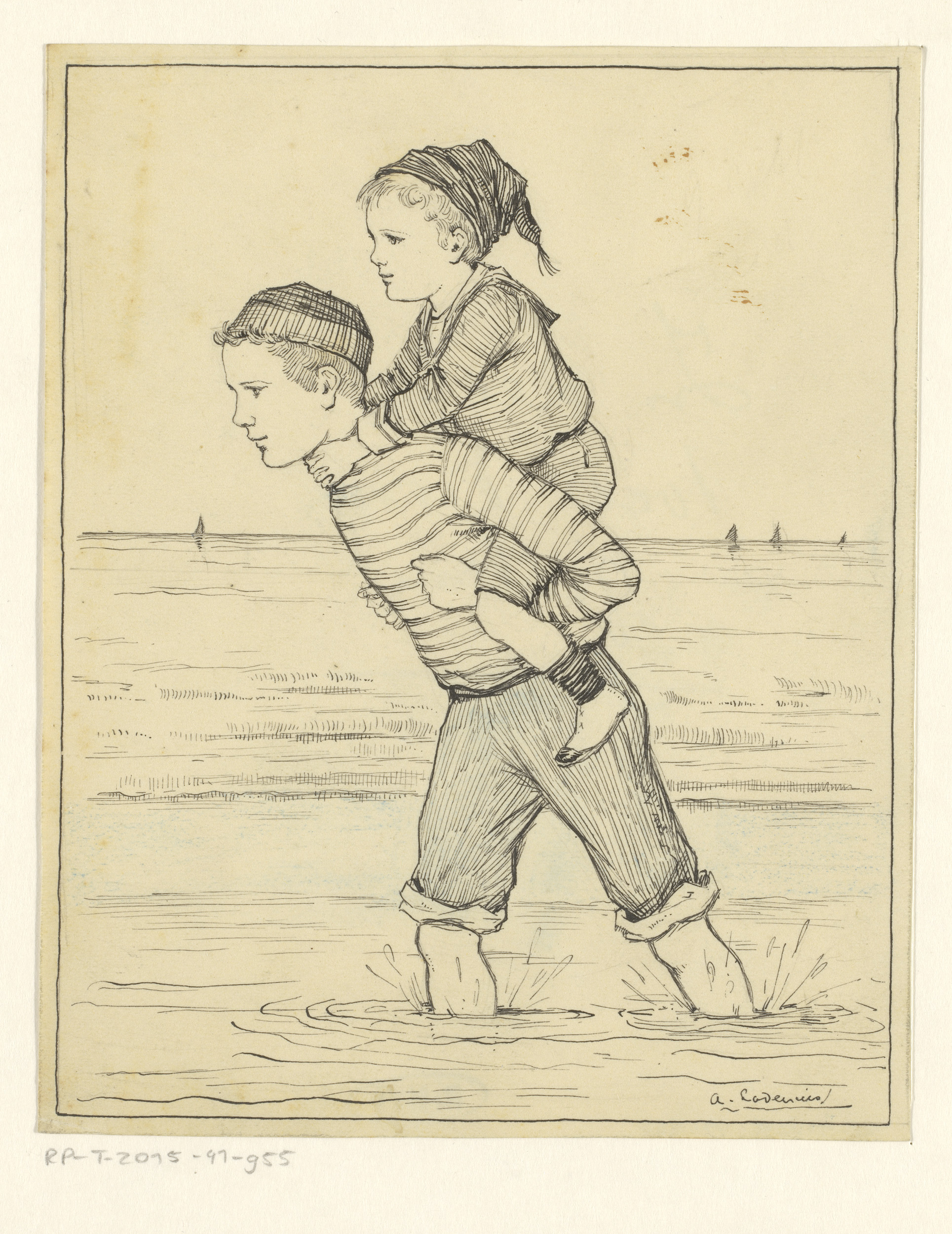 Jongen met kind op de rug lopend door zee