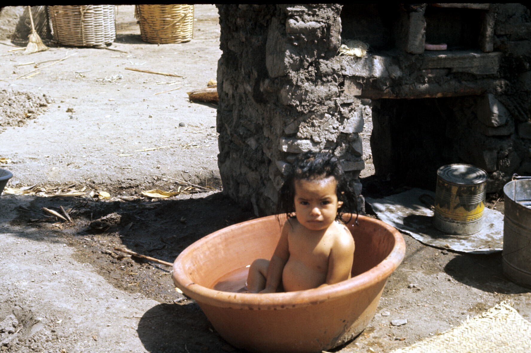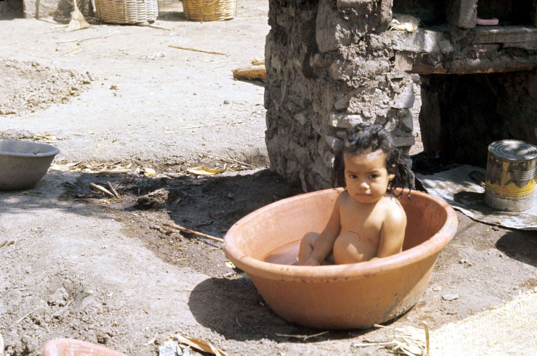 klein meisje, badend in 'apastle' (aardewerk waskom)