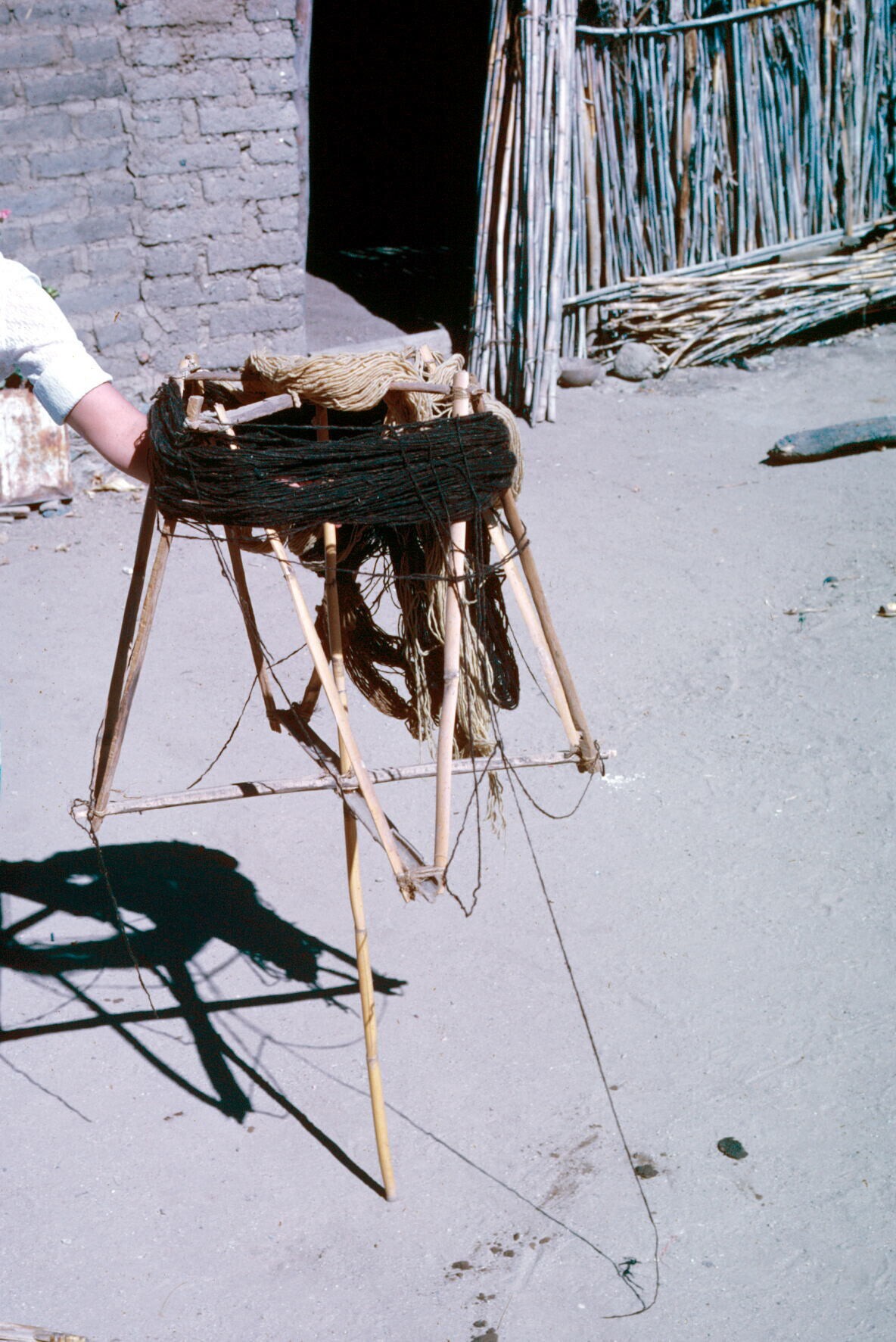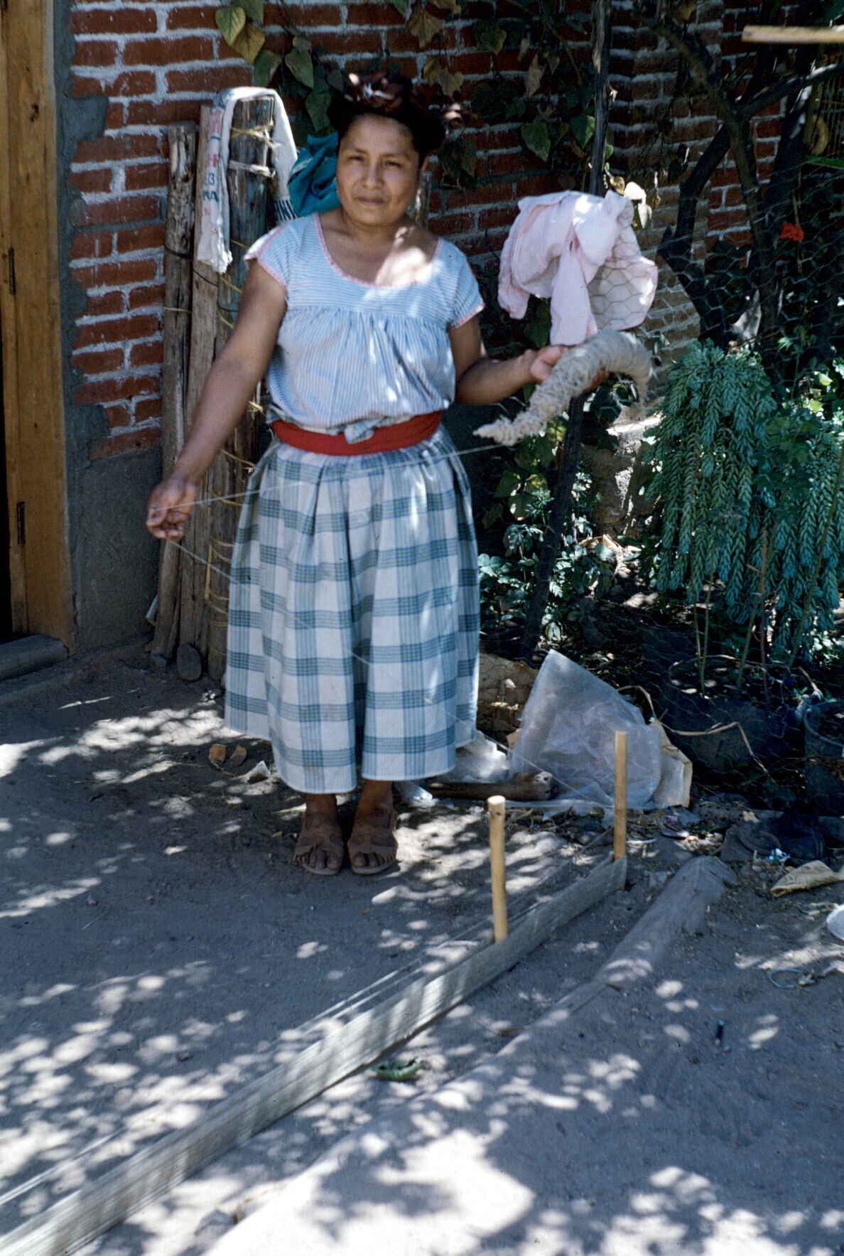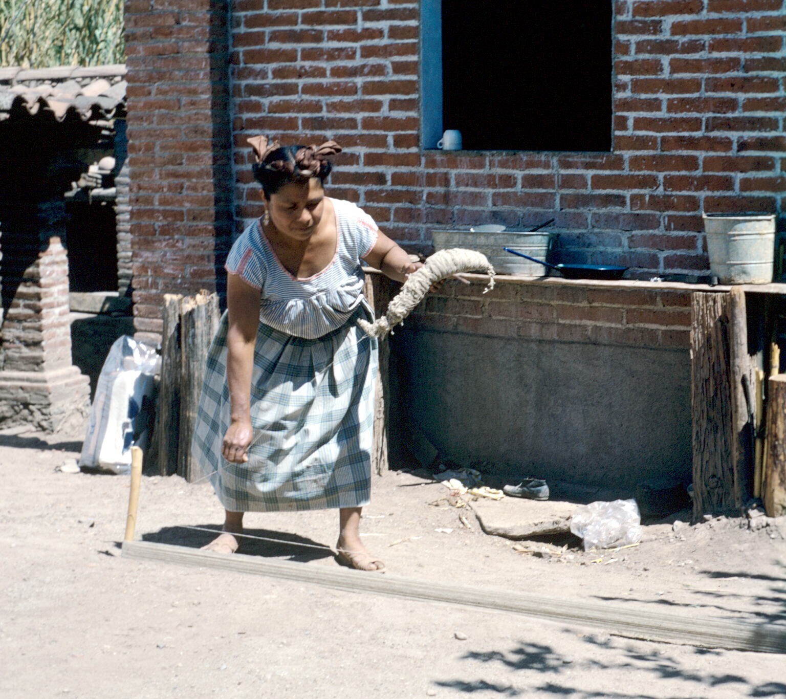 Doña Felipa Martínez met bundel garen voor huis