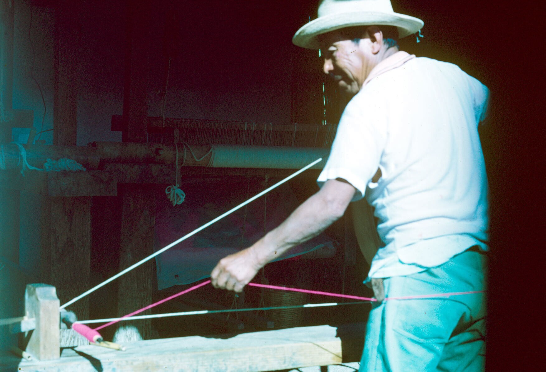 man, wevend op trapweefgetouw