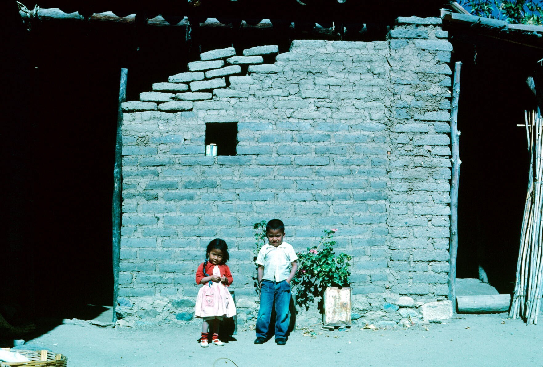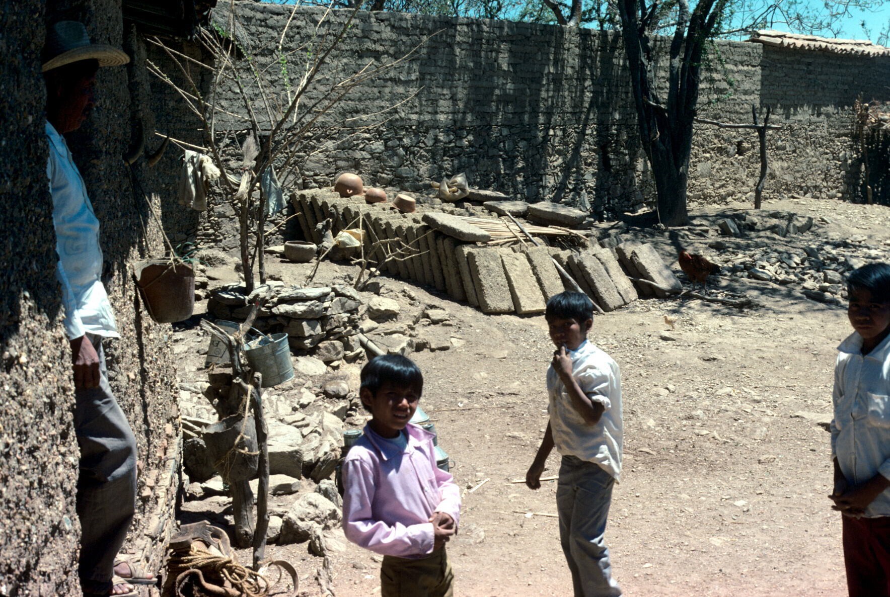 man en jongens bij huis met adobe tegels