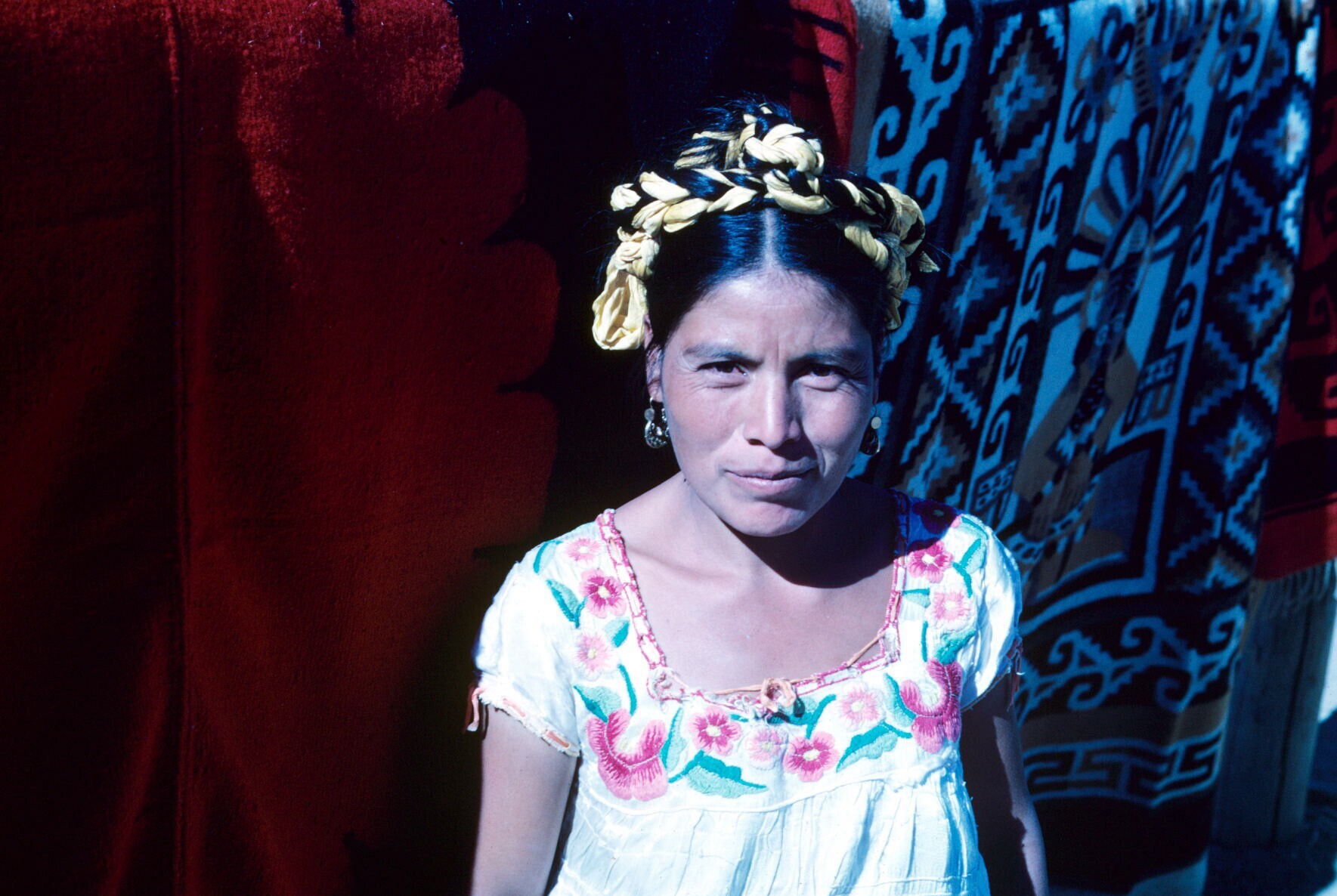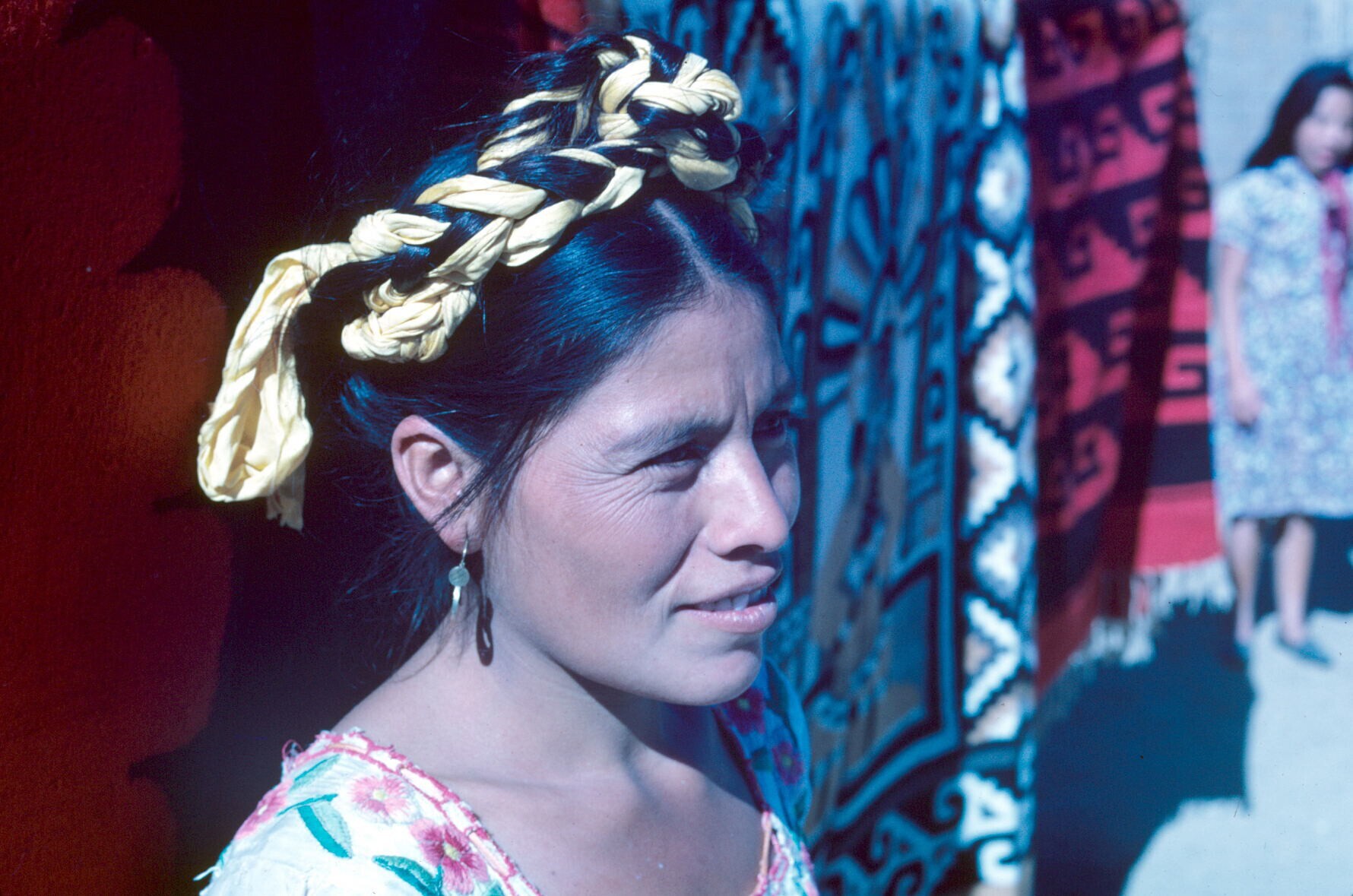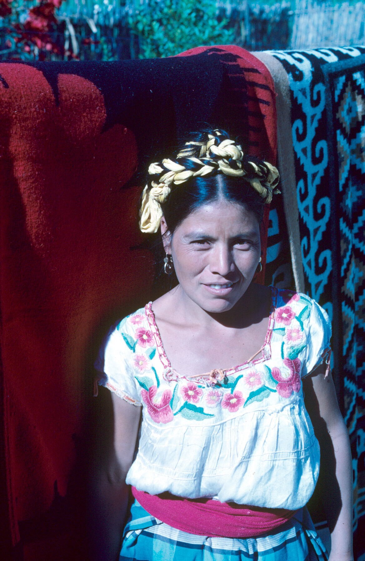 vrouw in typische lokale dracht voor geweven dekens