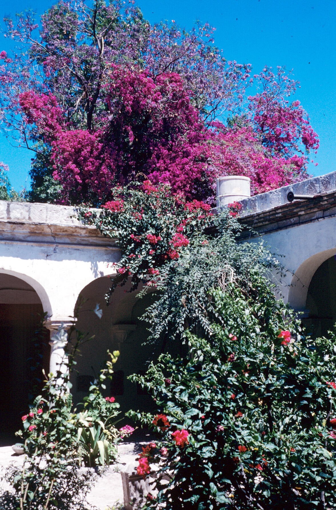 uitzicht door boograam op agave en cactus