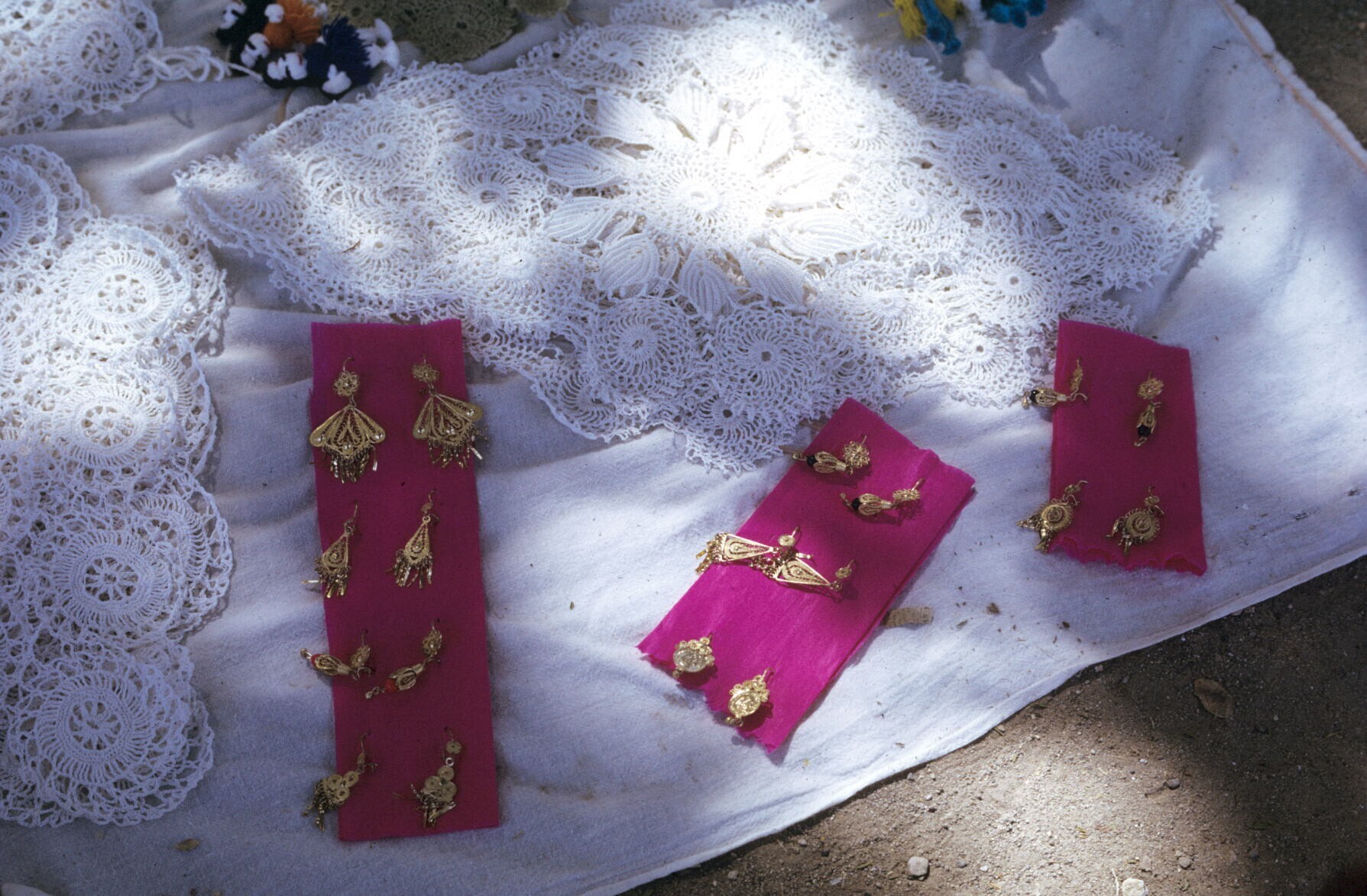 oorhangers en kantwerk op markt
