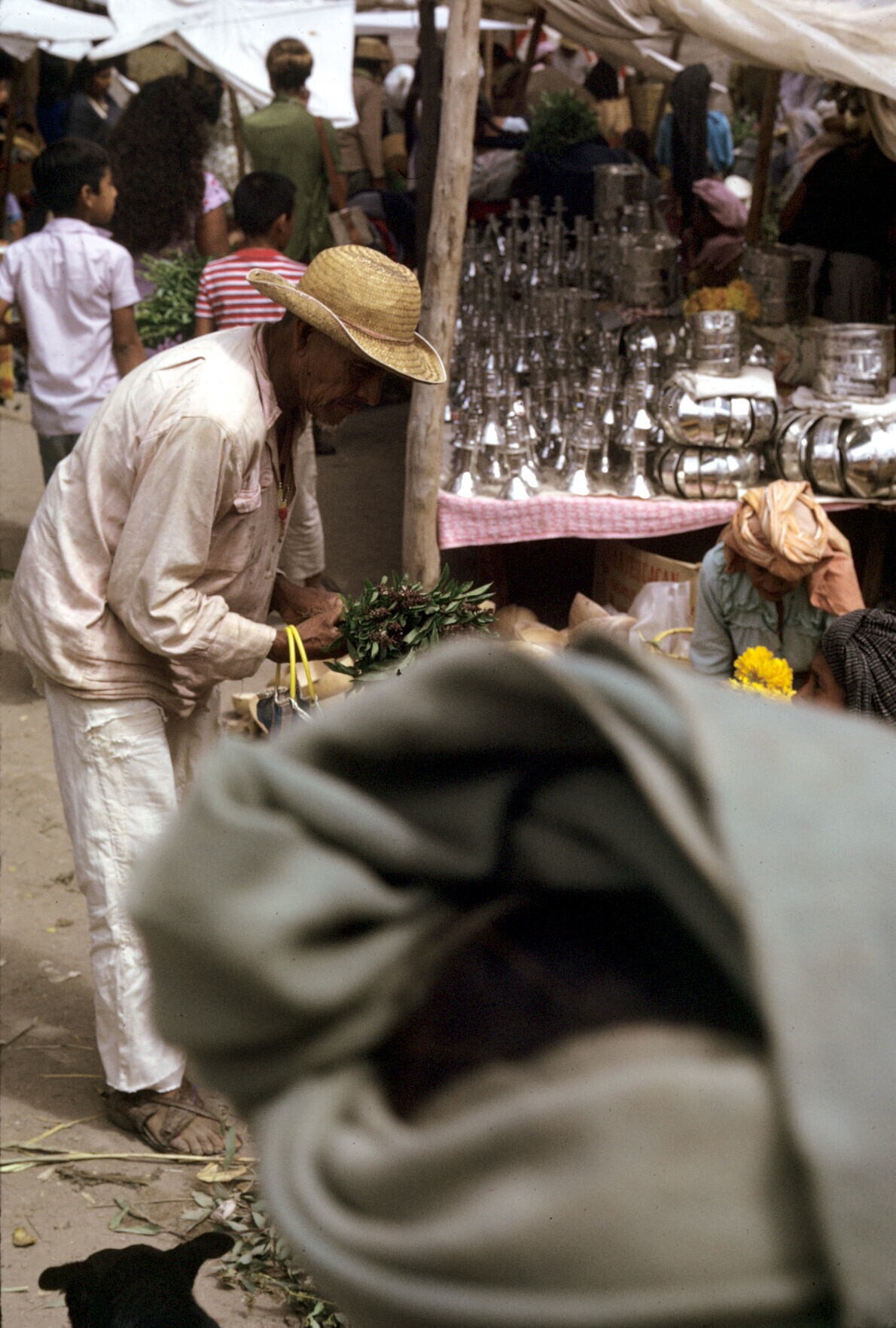 man met aardewerk op markt