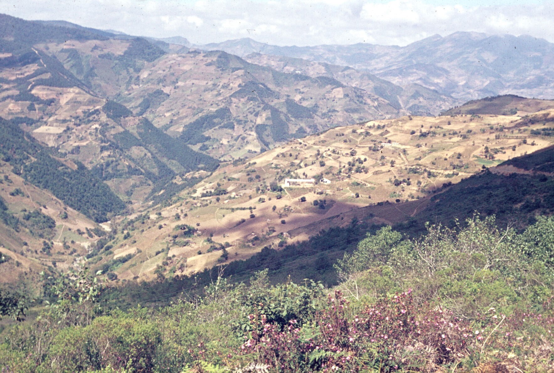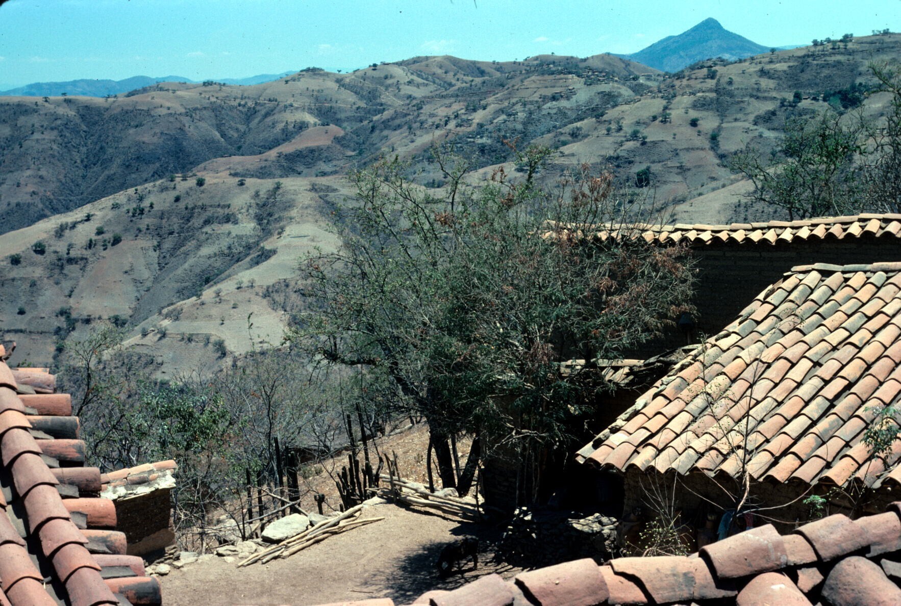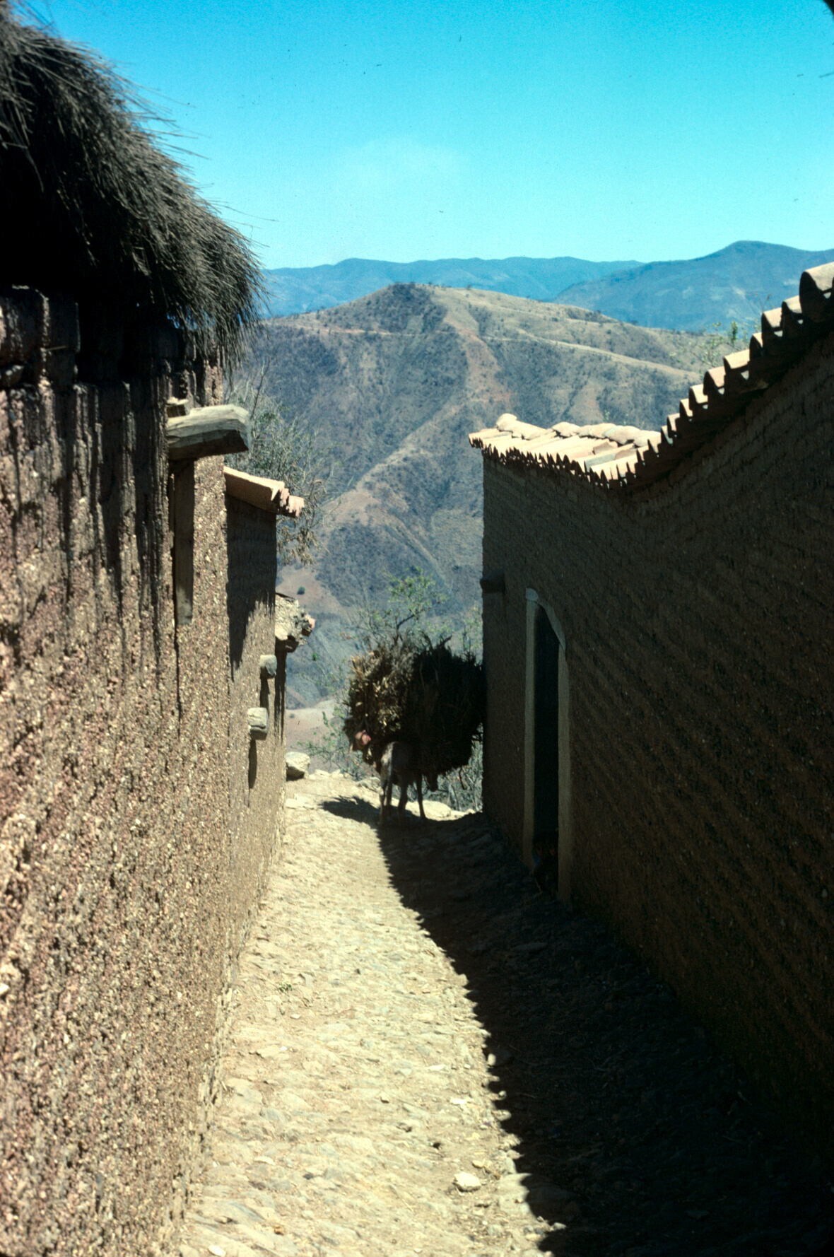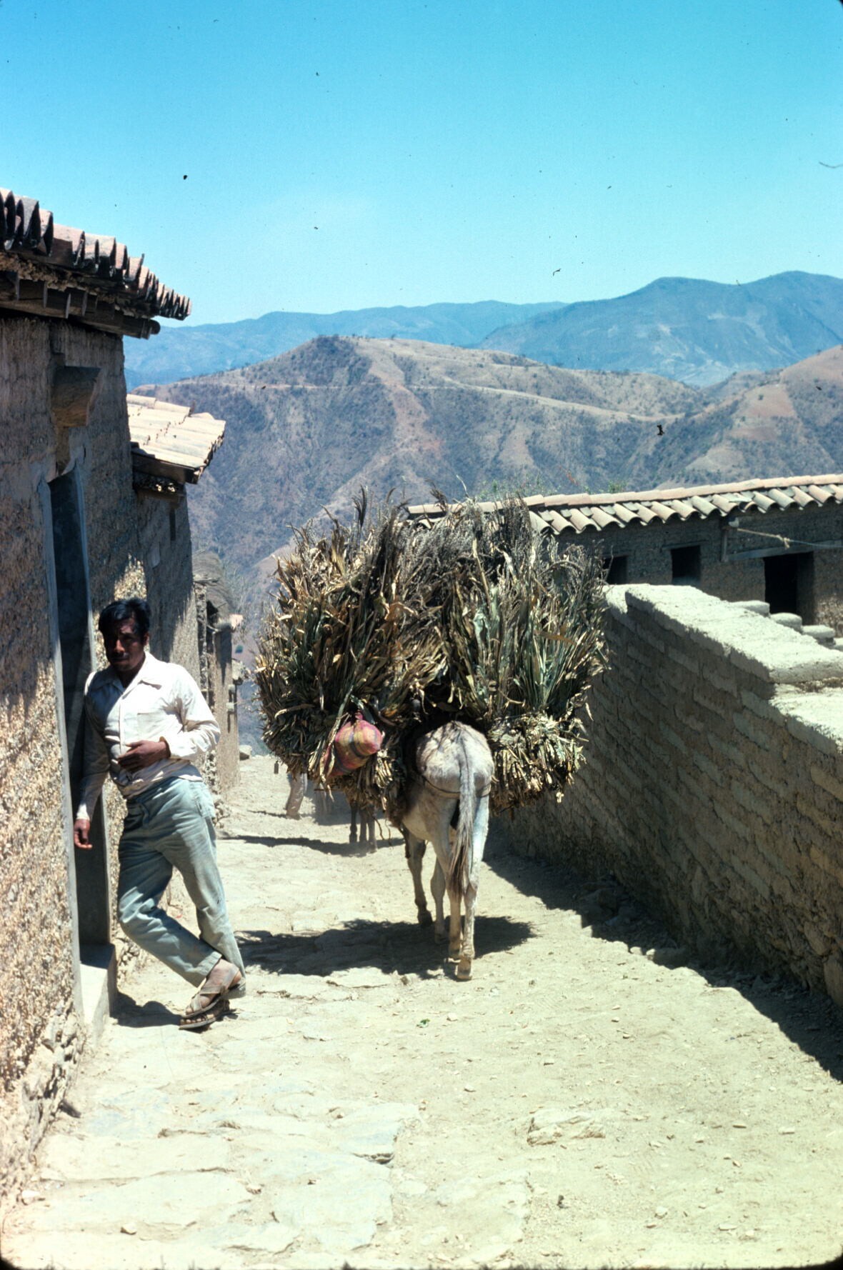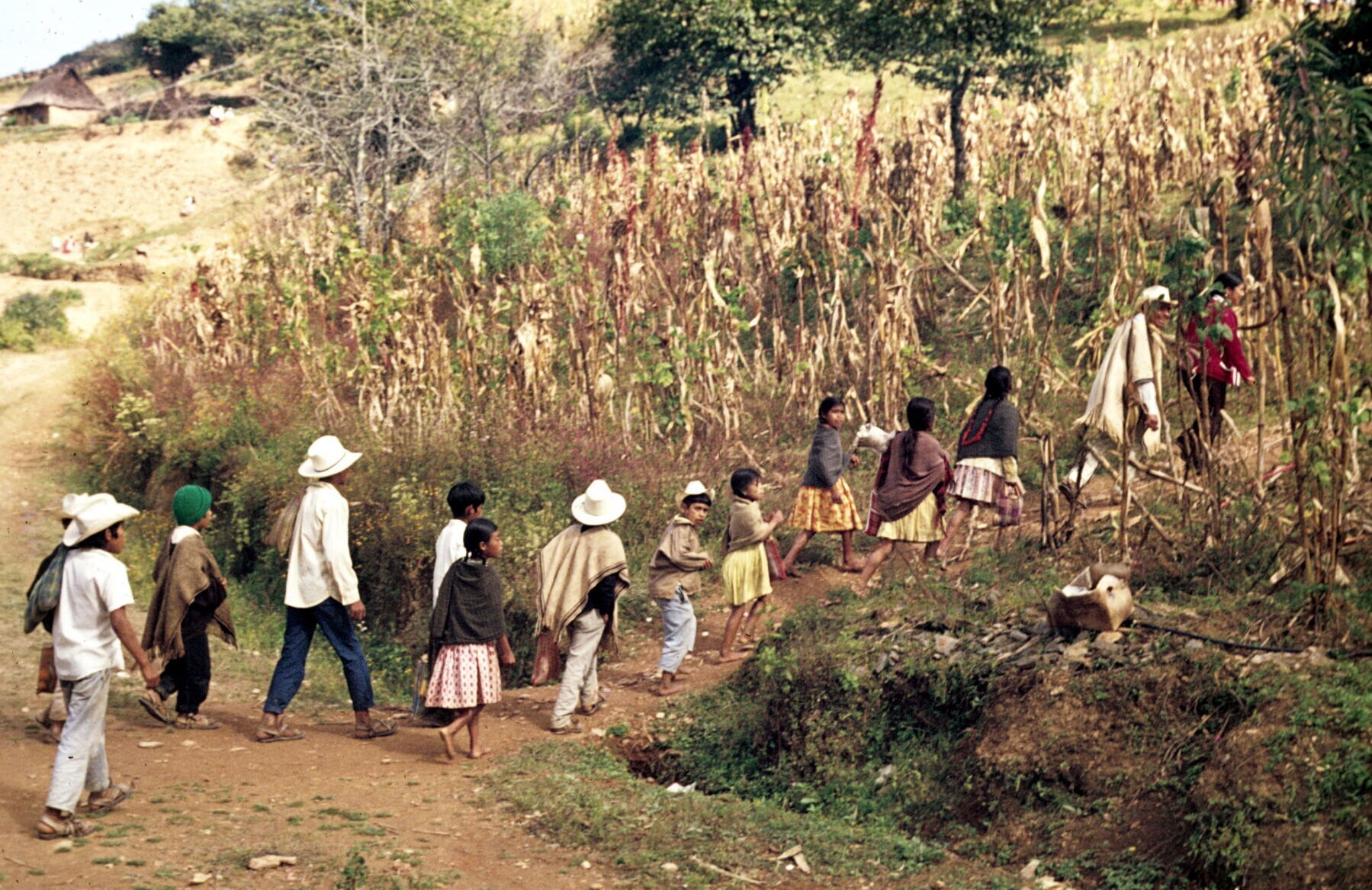 deel van het dorp met mannen in cotón (poncho) bij vee