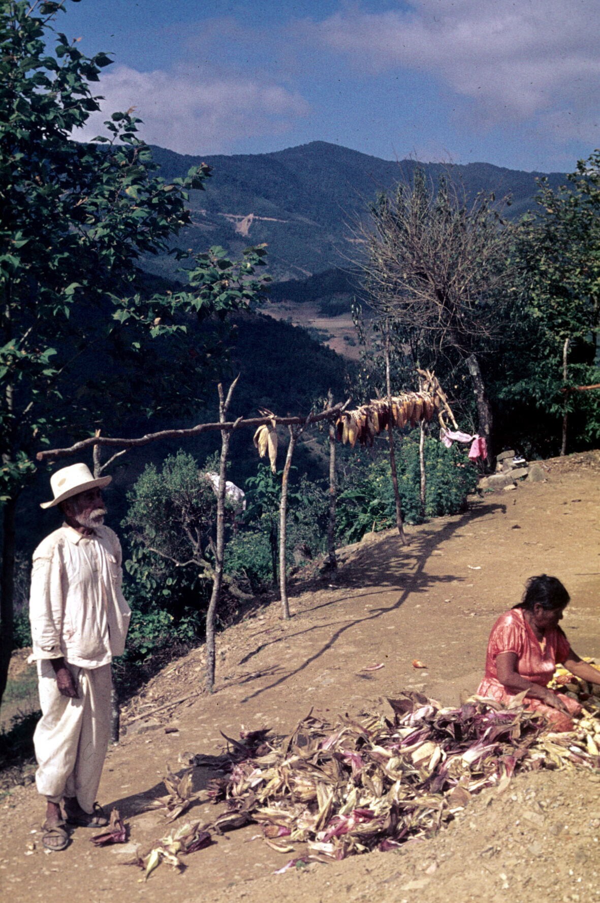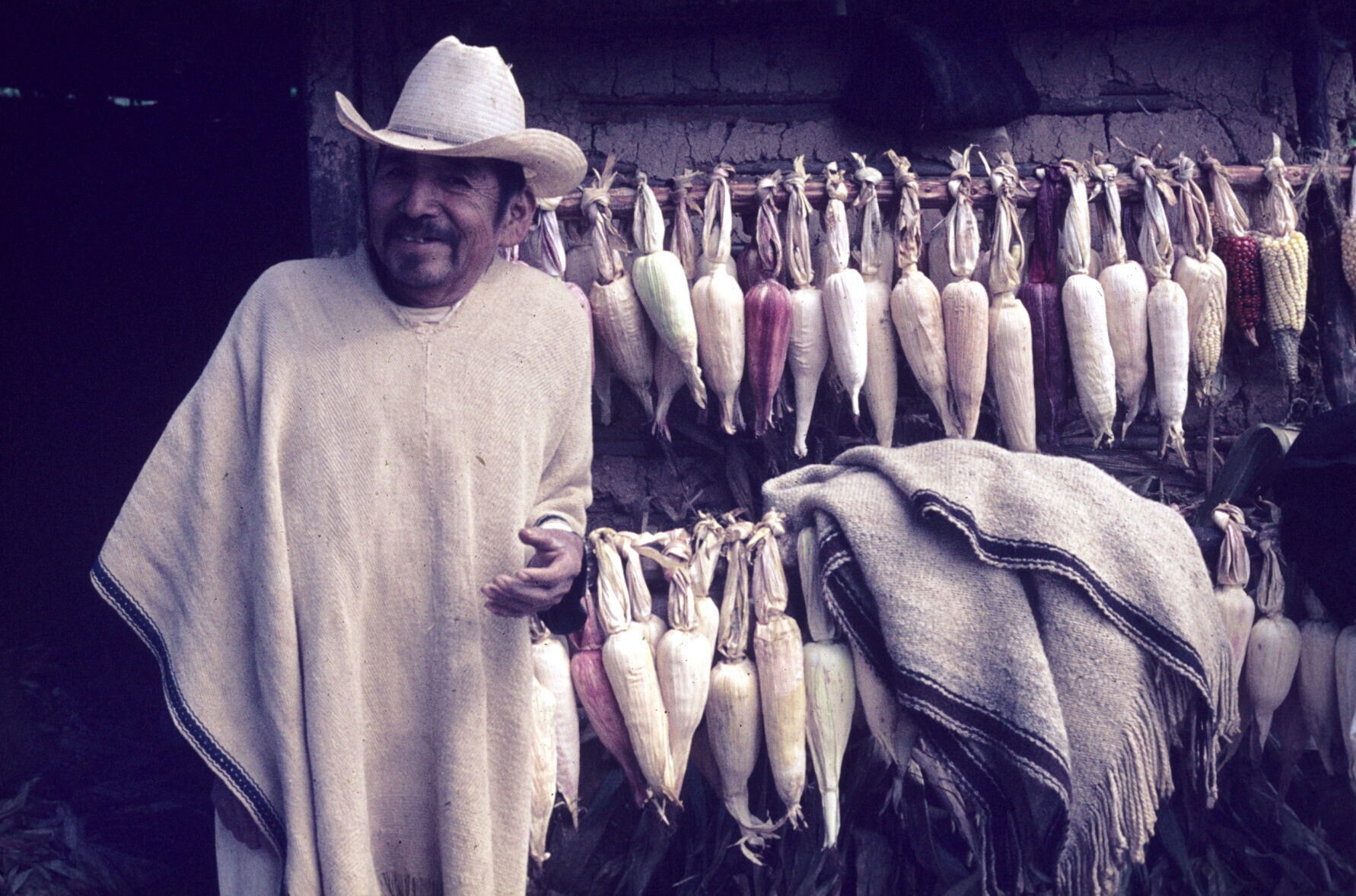 man in cotón (poncho) bij te drogen opgehangen maïsk...