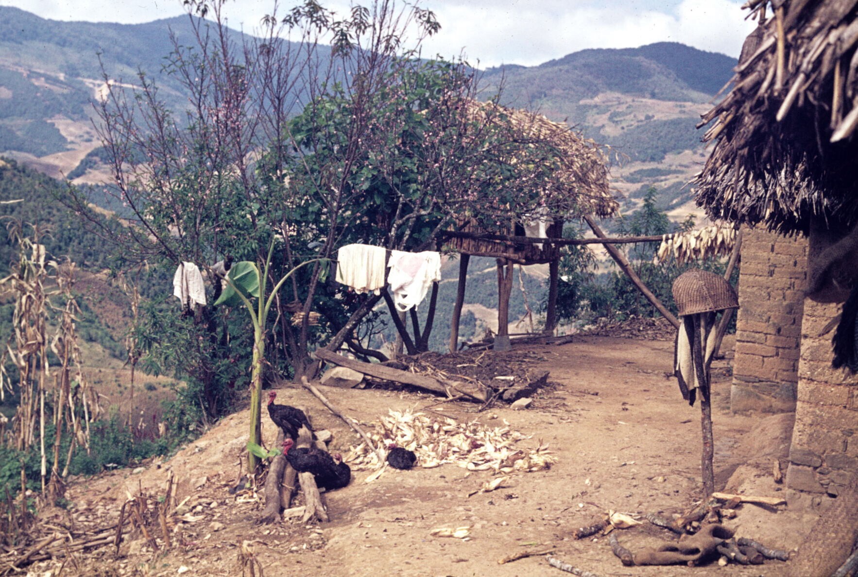 vrouw bij geoogste maïs op erf