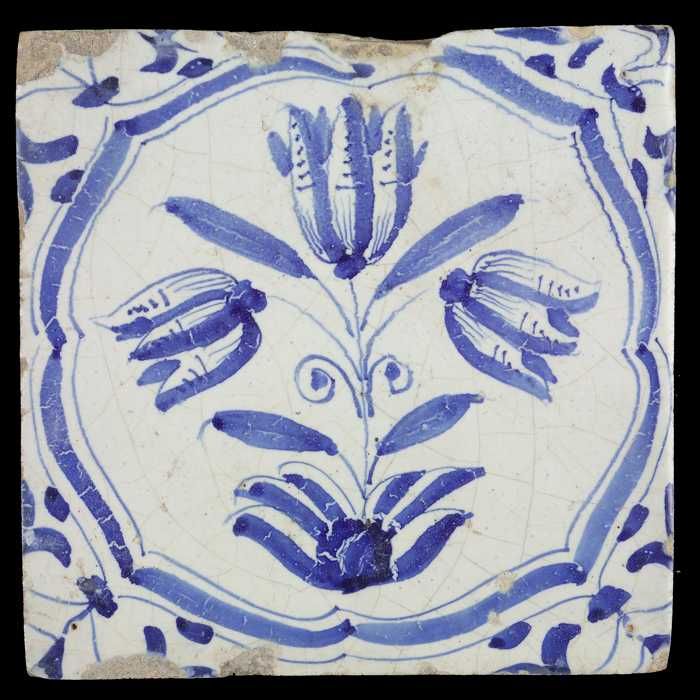 Bloemtegel met drietulp in accolades, blauw decor op...