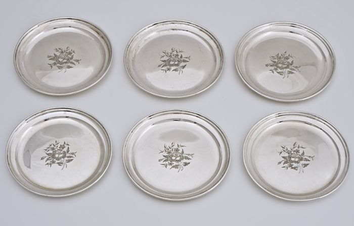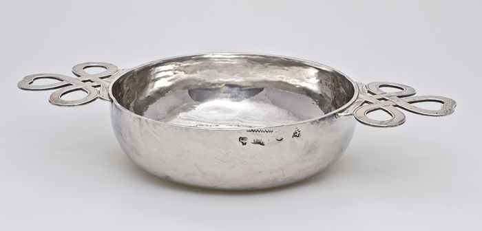Zilveren drinkschaal op gedreven voet, met gegraveer...