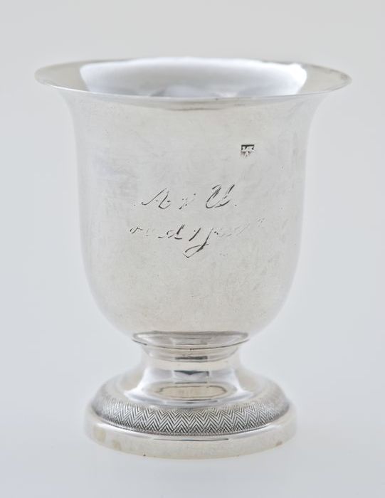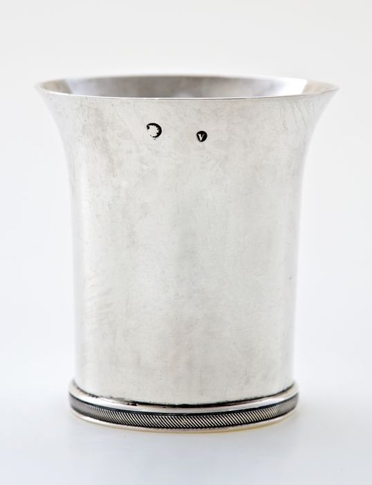 Zilveren kinderbeker op voet, "A v U oud 1 jaar"