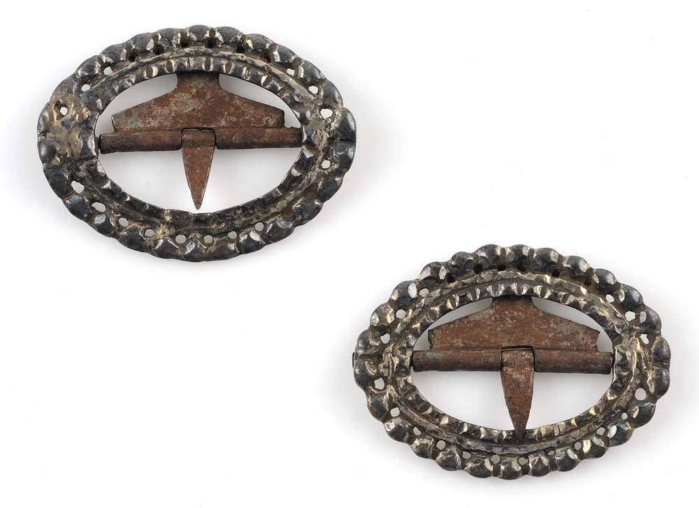 2 zilveren schoengespen, met metalen bevestiging, 19...