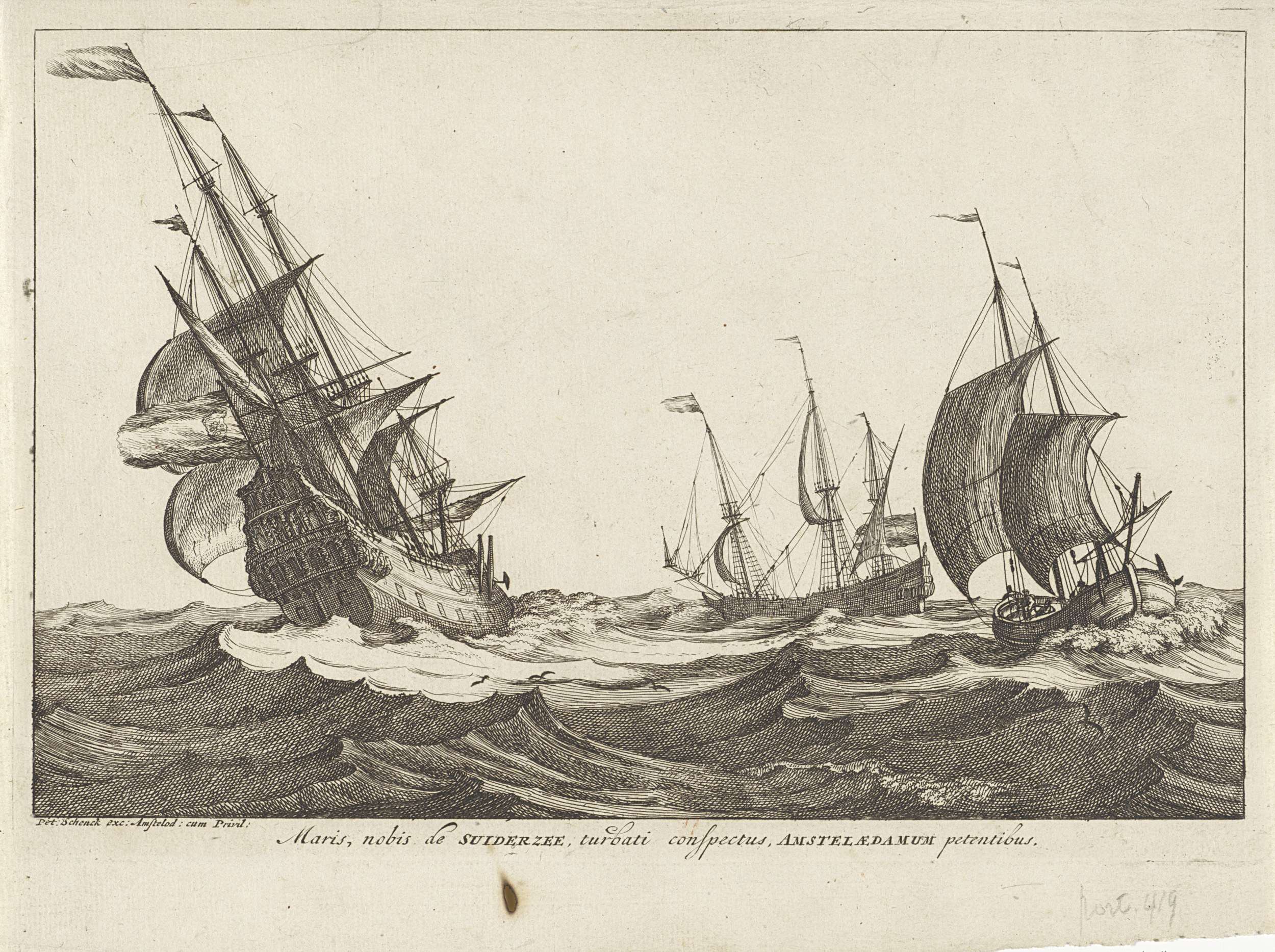 Woelige zee met rechts een oorlogsschip onder zeil