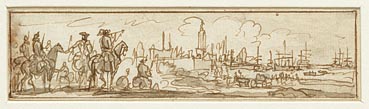 Havenstad met op de voorgrond een zestal ruiters, vo...
