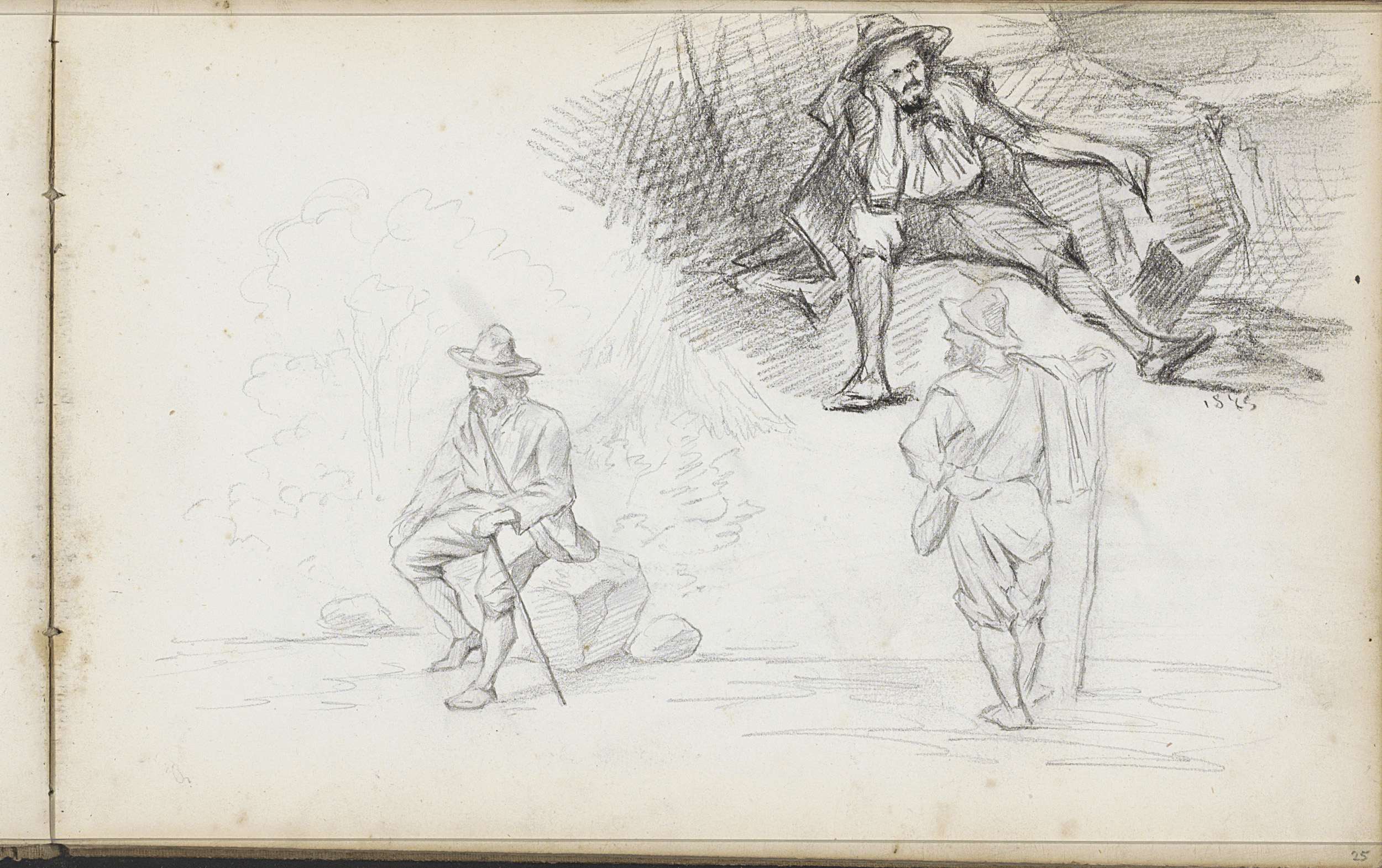 Rustende reizigers in een heuvellandschap