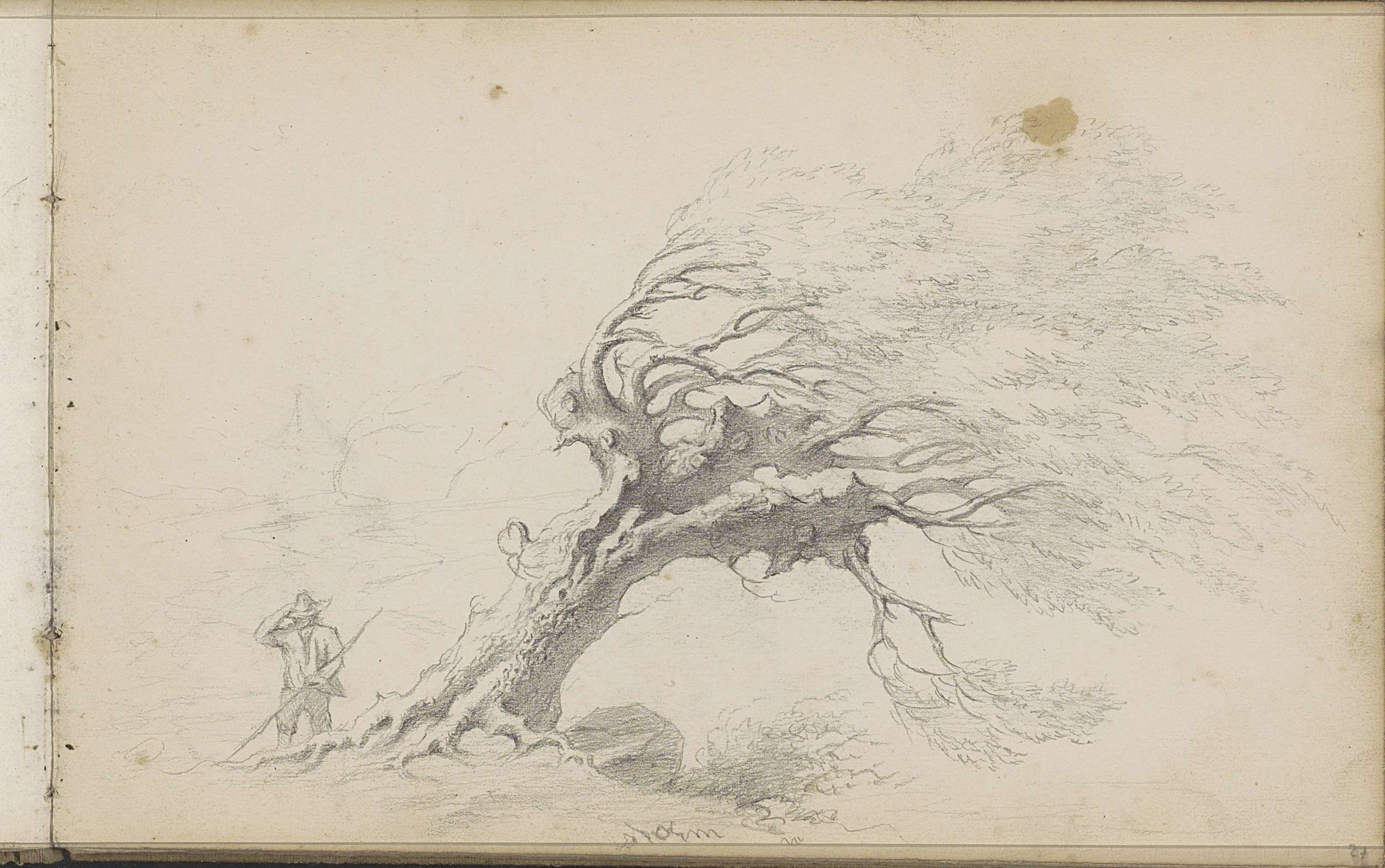 Reiziger naast een overhellende boom
