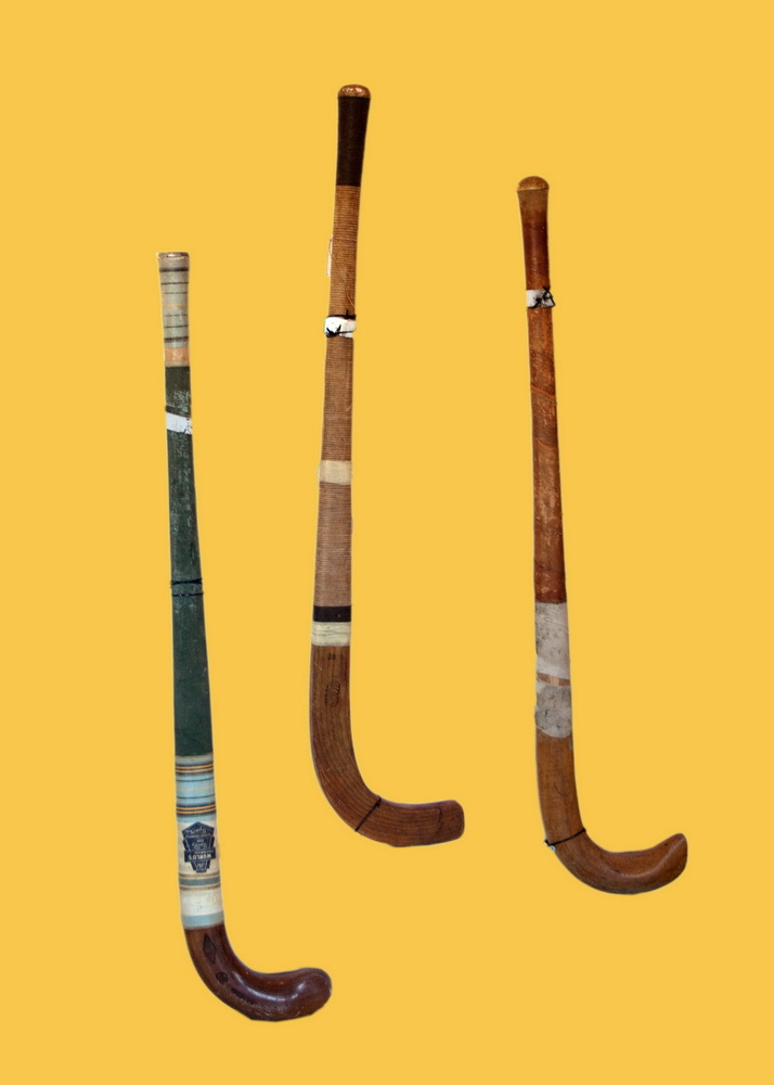 3 hockey sticks; van rechts naar links: houten stick...