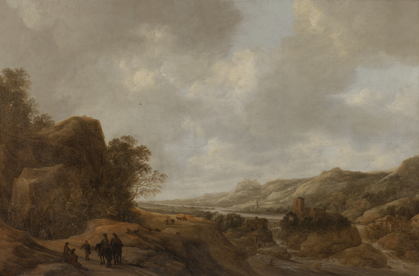 Heuvelachtig rivierlandschap met reizigers
