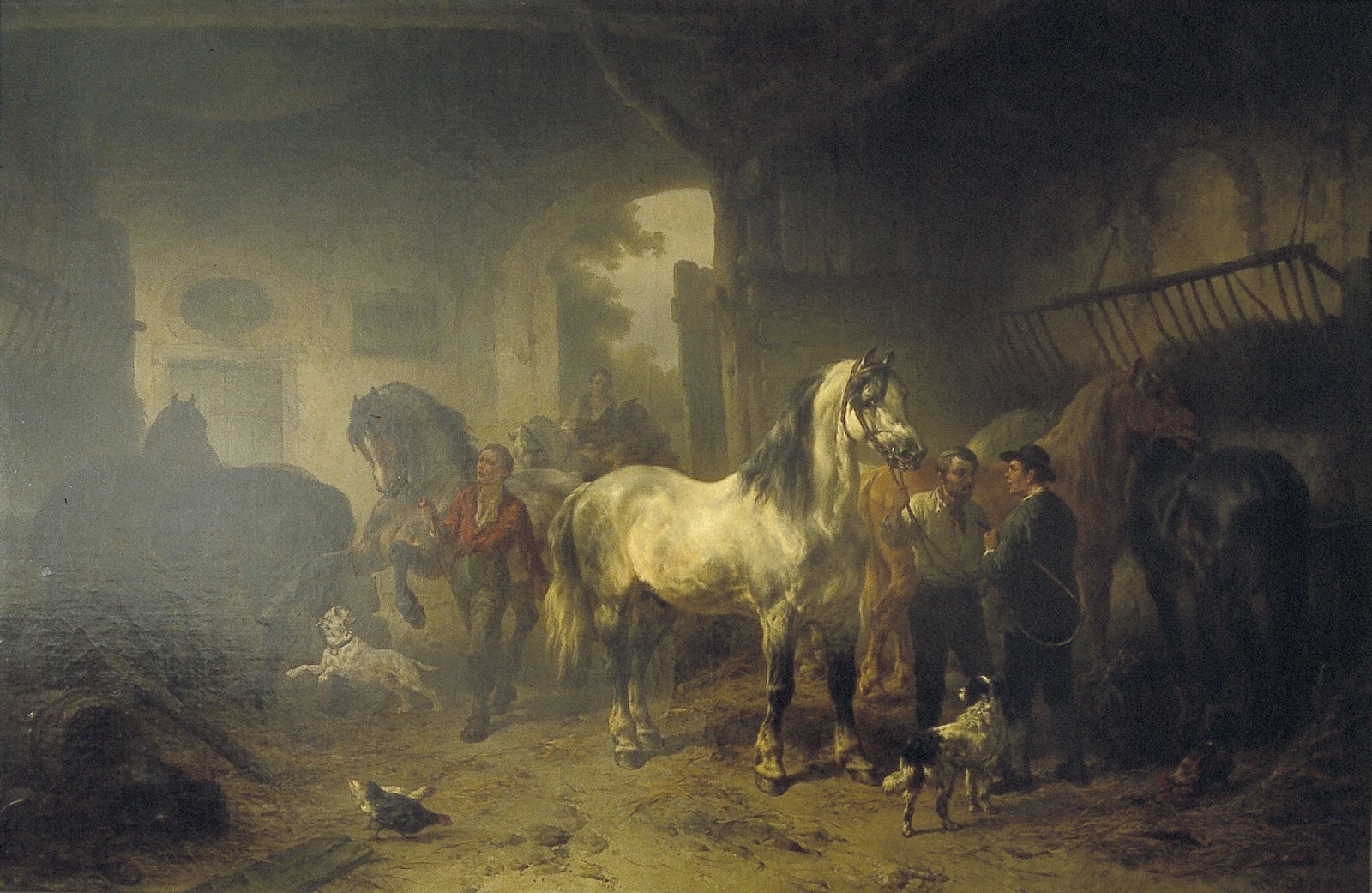 Interieur van een stal met paarden en figuren