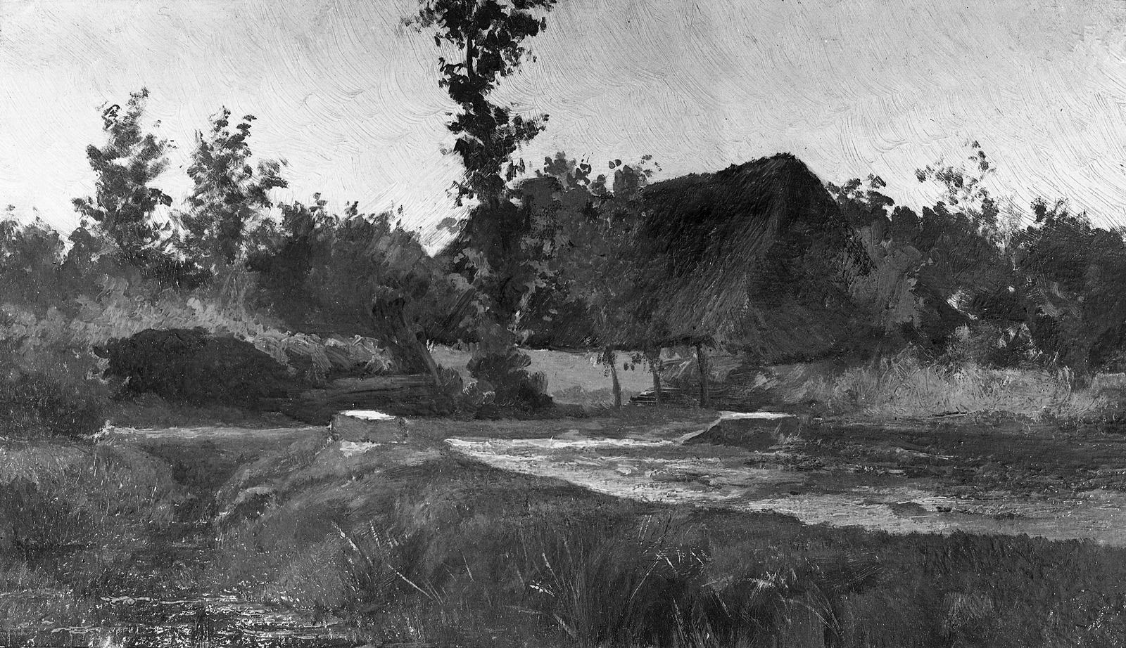 Zandweg met een beekje bij een schuur