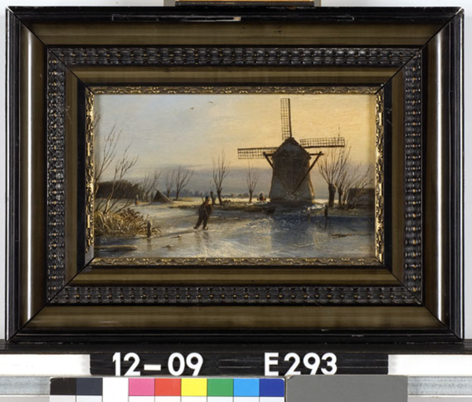 Wintertafereel met windmolen en schaatser