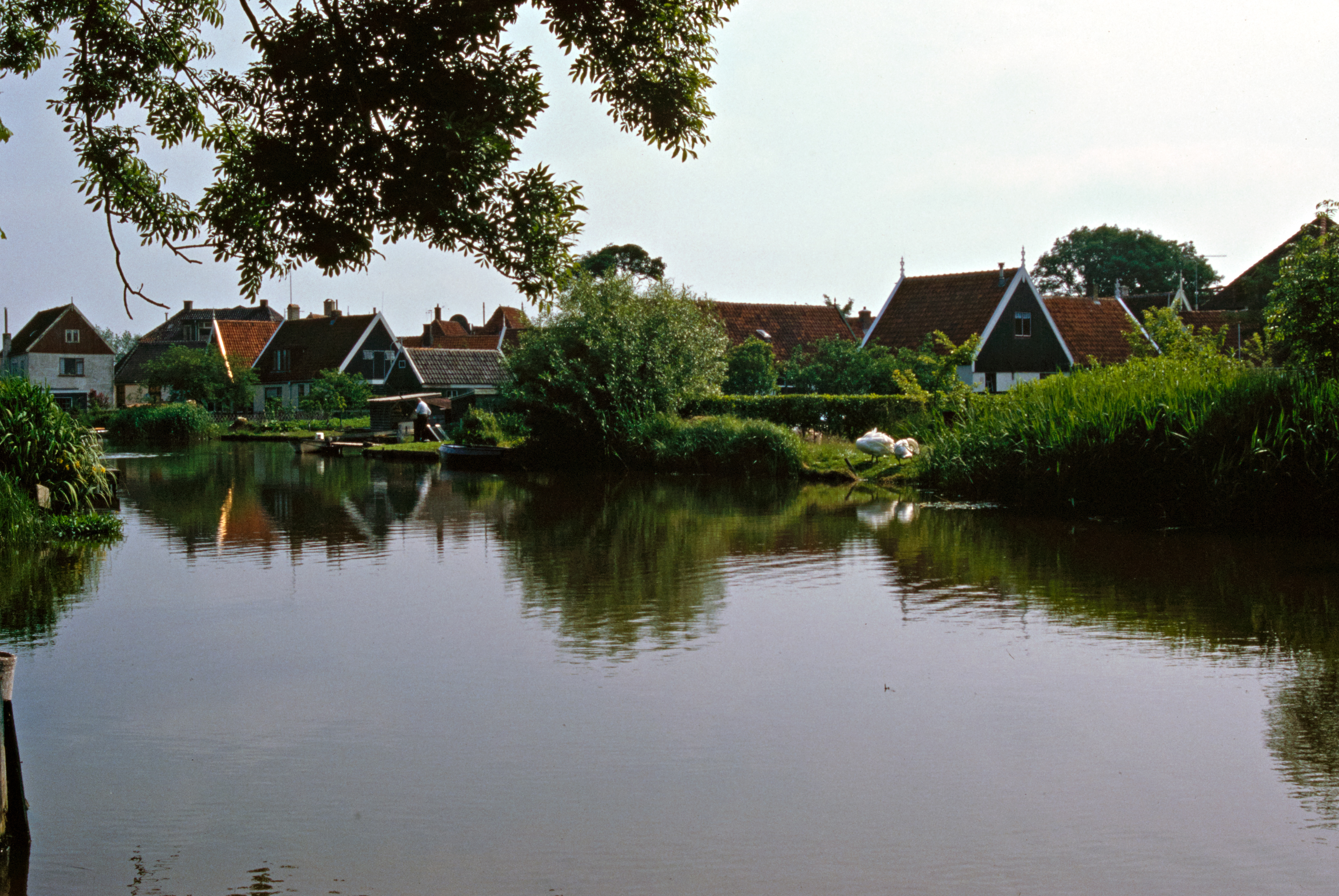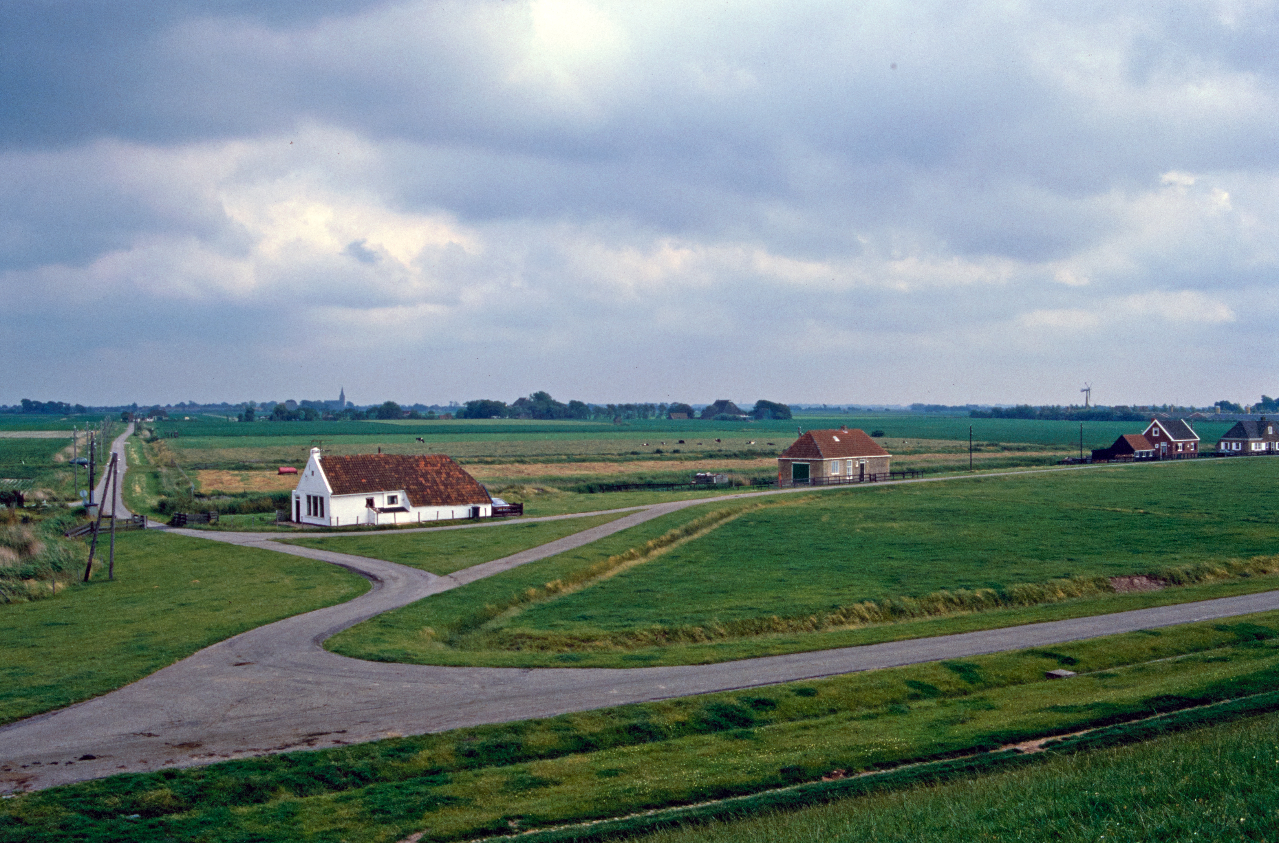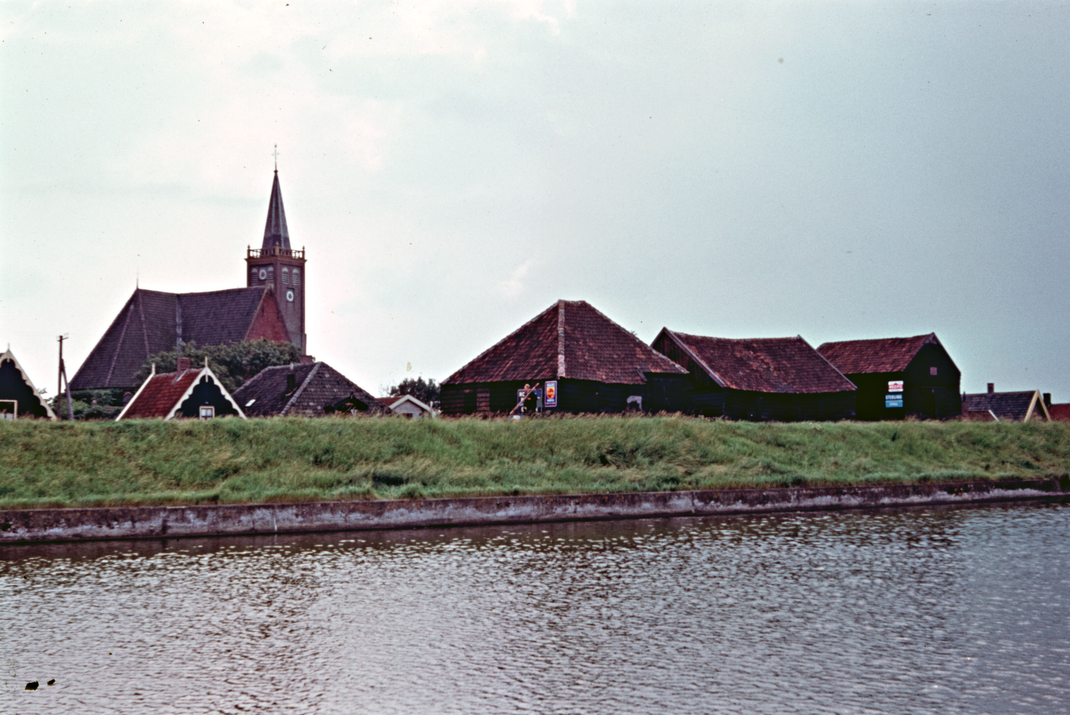 Boerderijen aan vaart met raadhuis in de verte