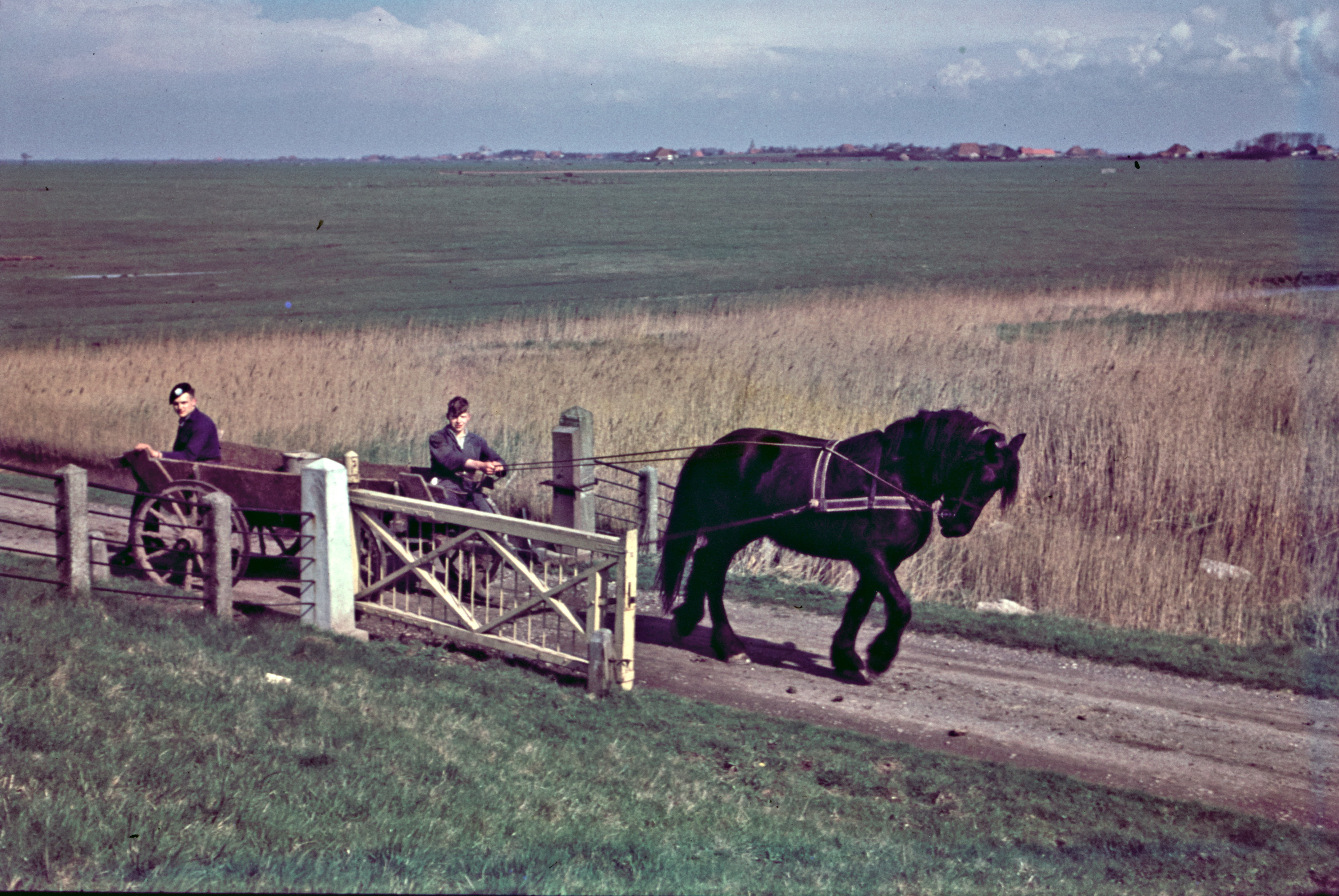 Paard en wagen passeert draaihek
