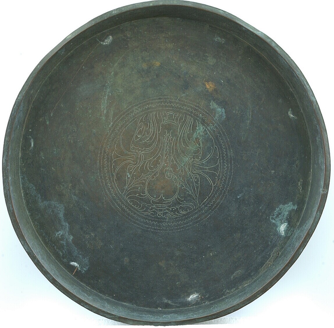 Bronzen dienblad met gravure op de bodem