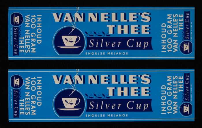Twee blauwe labels VAN NELLE'S SILVER CUP THEE, Enge...
