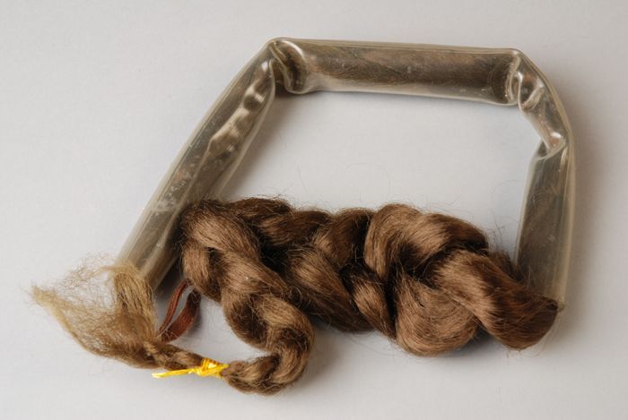 Twee losse haarvlechten van echt mensenhaar (A-B), i...