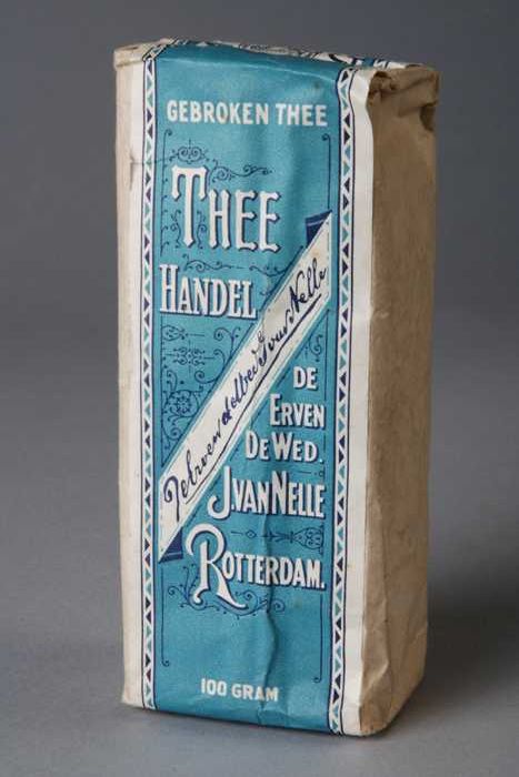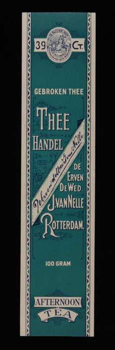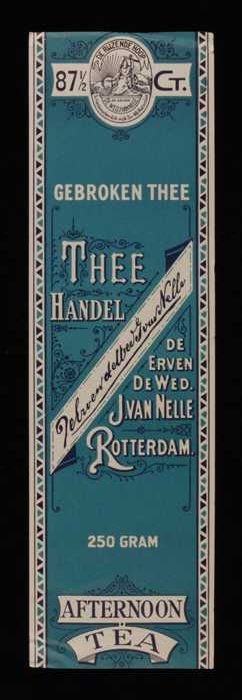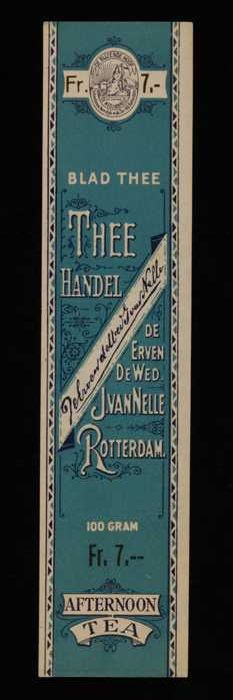 Blauw, papieren label VAN NELLE AFTERNOON THEE, blad...