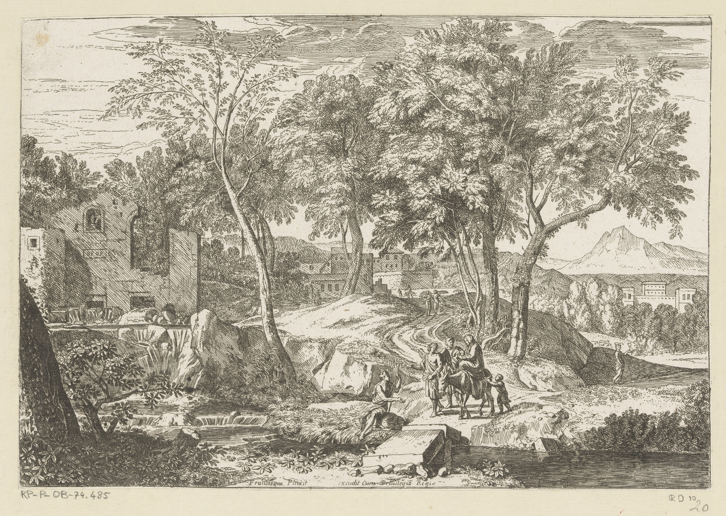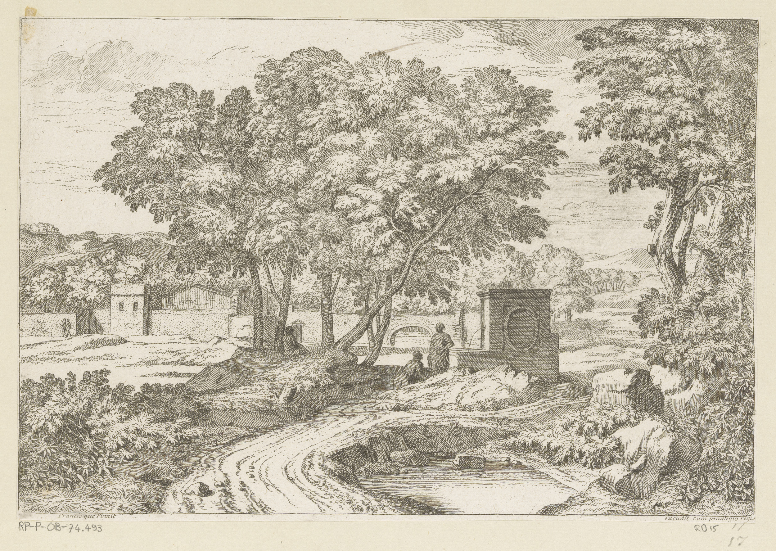 Arcadisch landschap met twee vrouwen bij een fontein