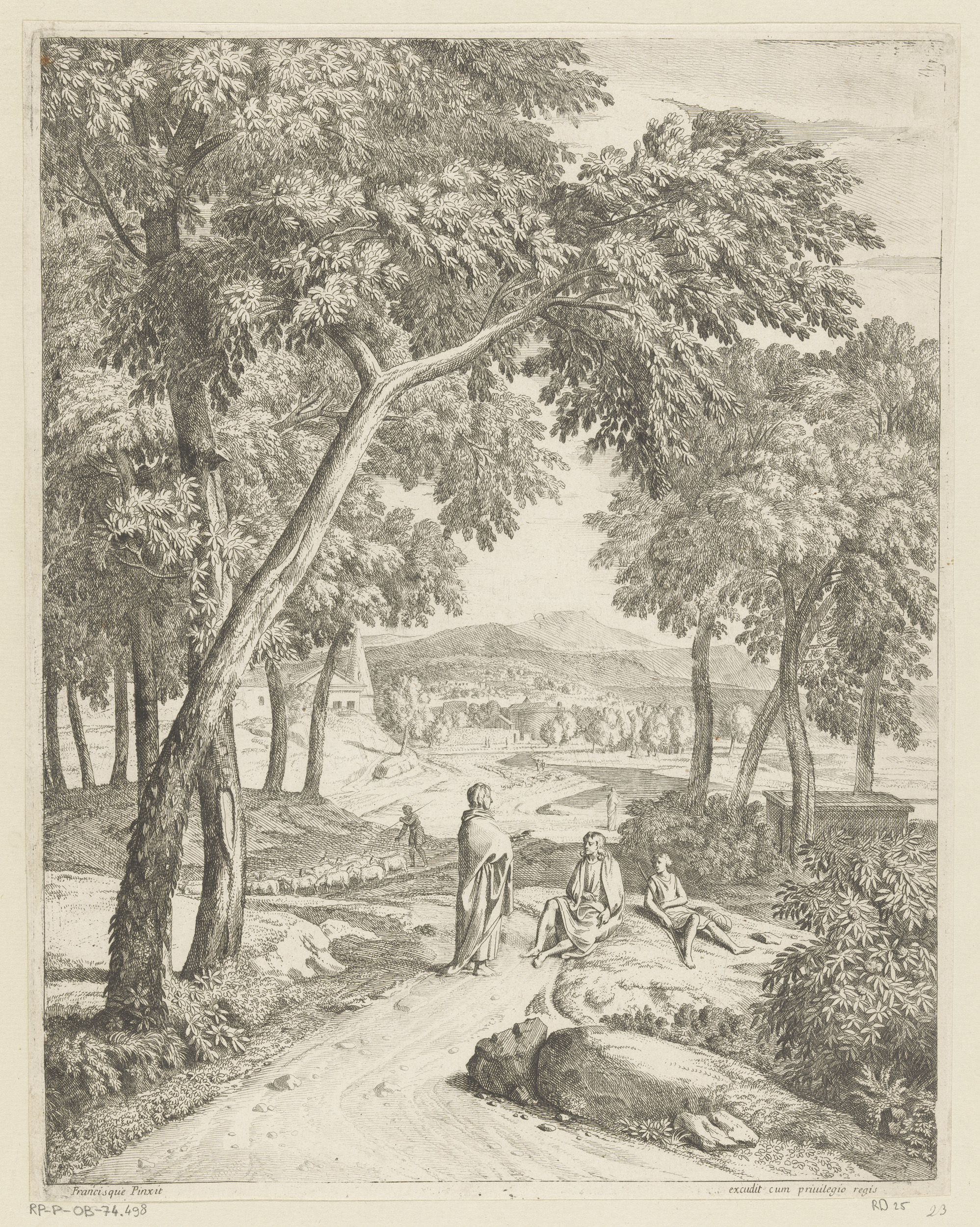 Arcadisch landschap met figuren op een pad onder een...