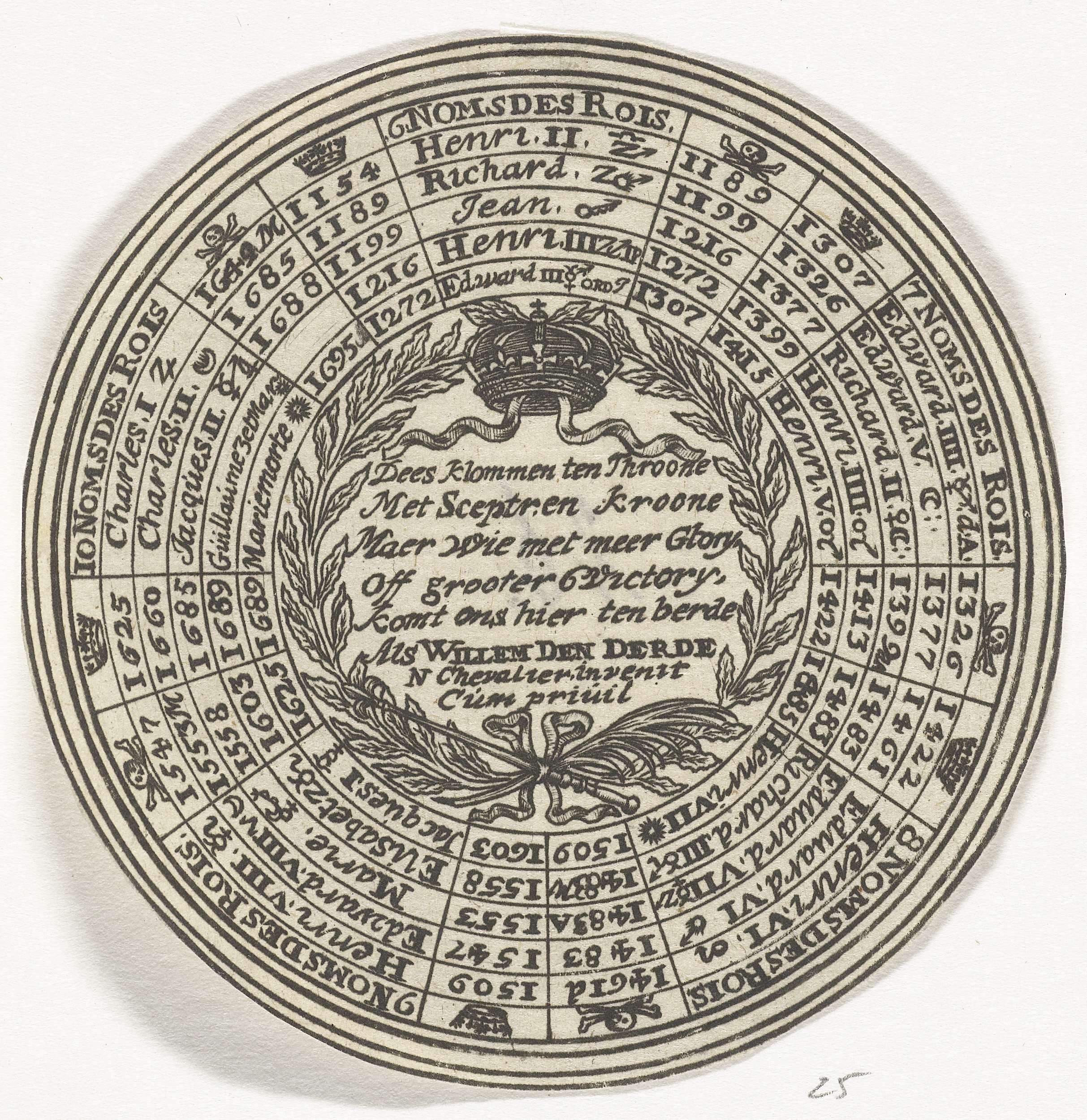 Penning met een gedicht en de namen van Engelse koni...