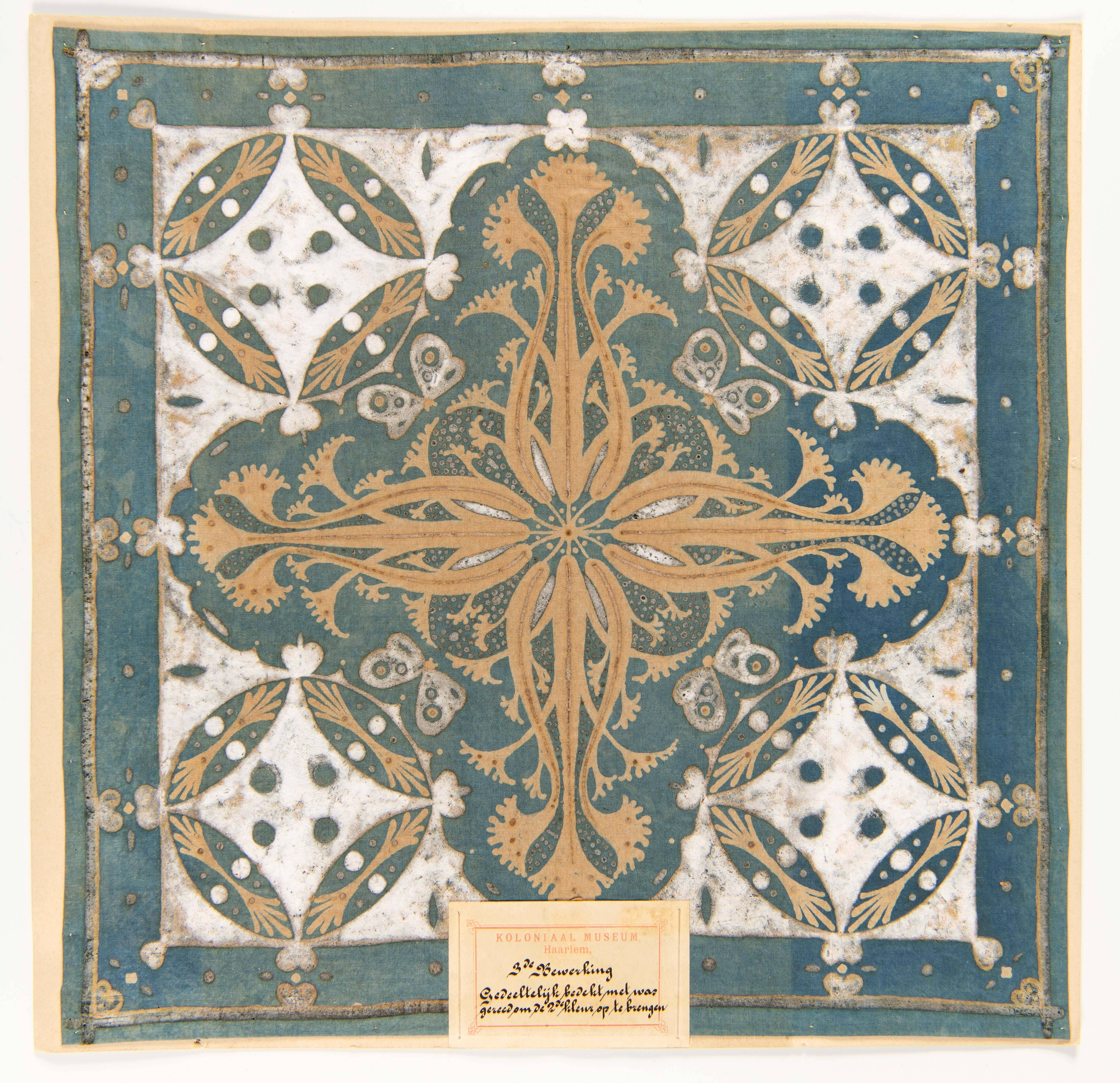 Blauw gebatikt katoenen doek, versierd met het rusak...