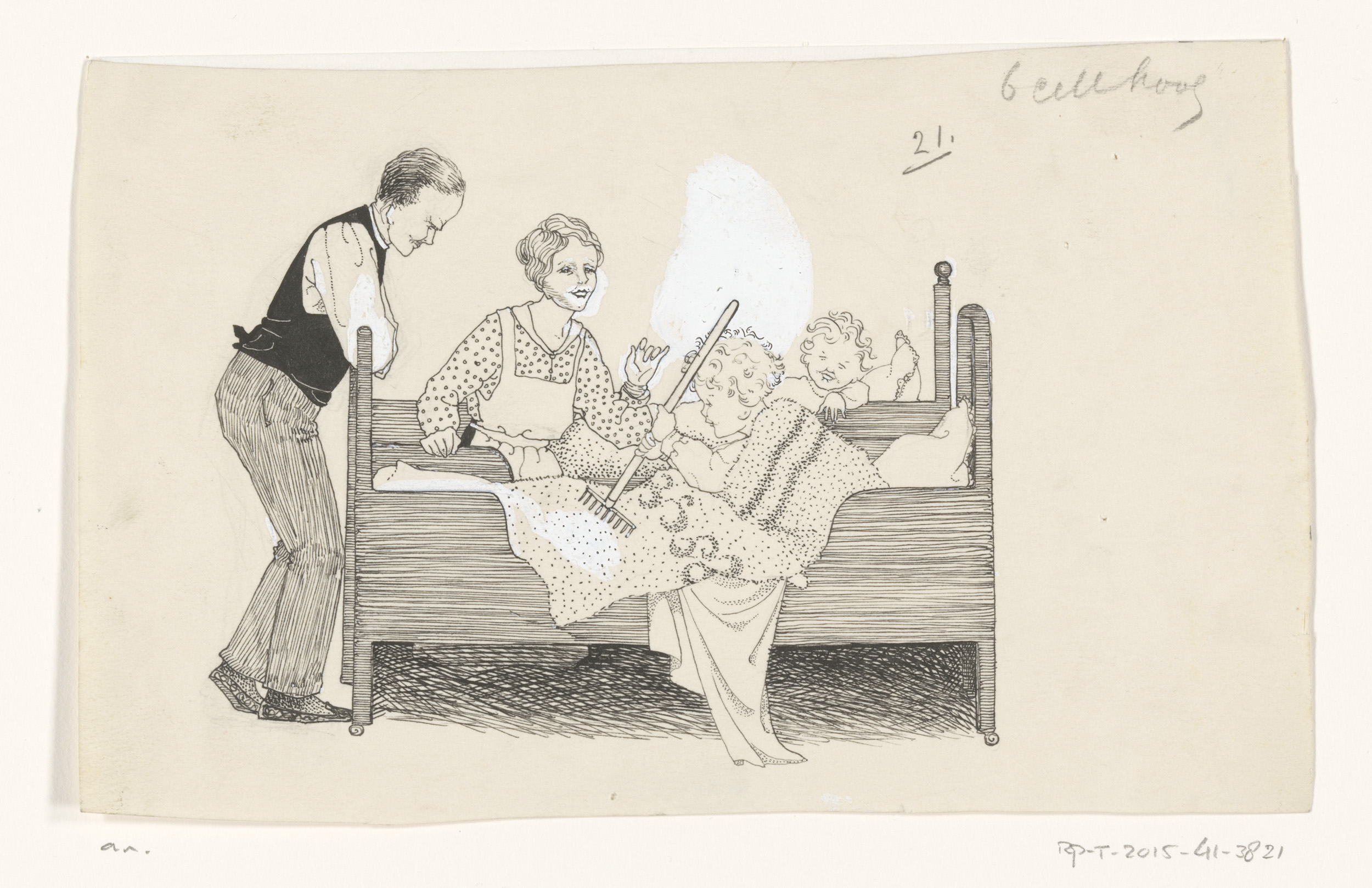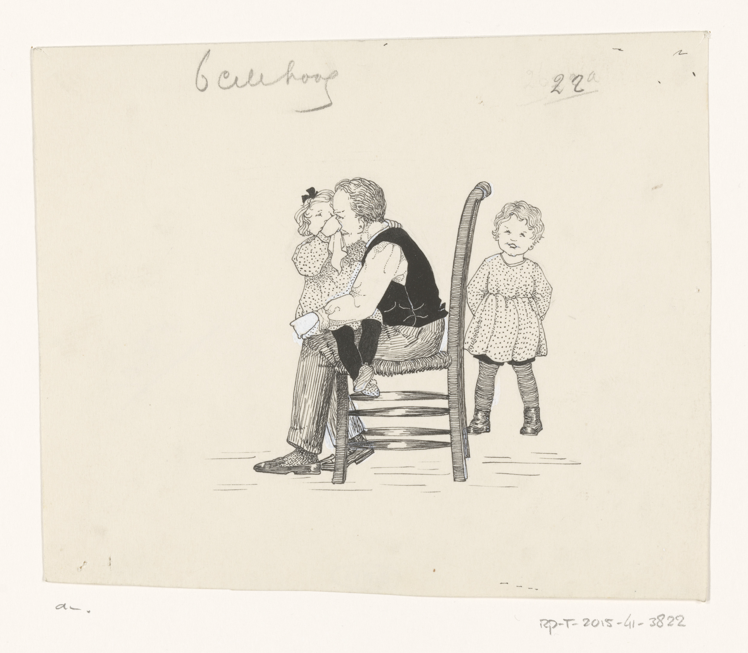 Interieur met een oude vrouw en drie kinderen