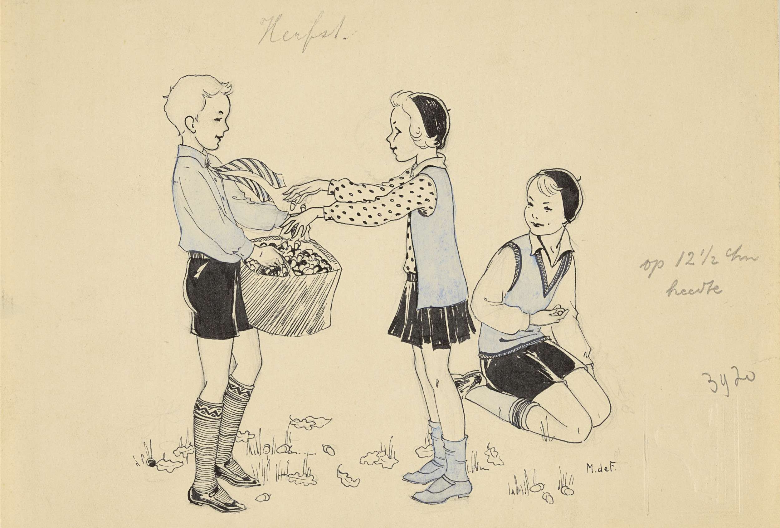 Drie kinderen die eikels rapen