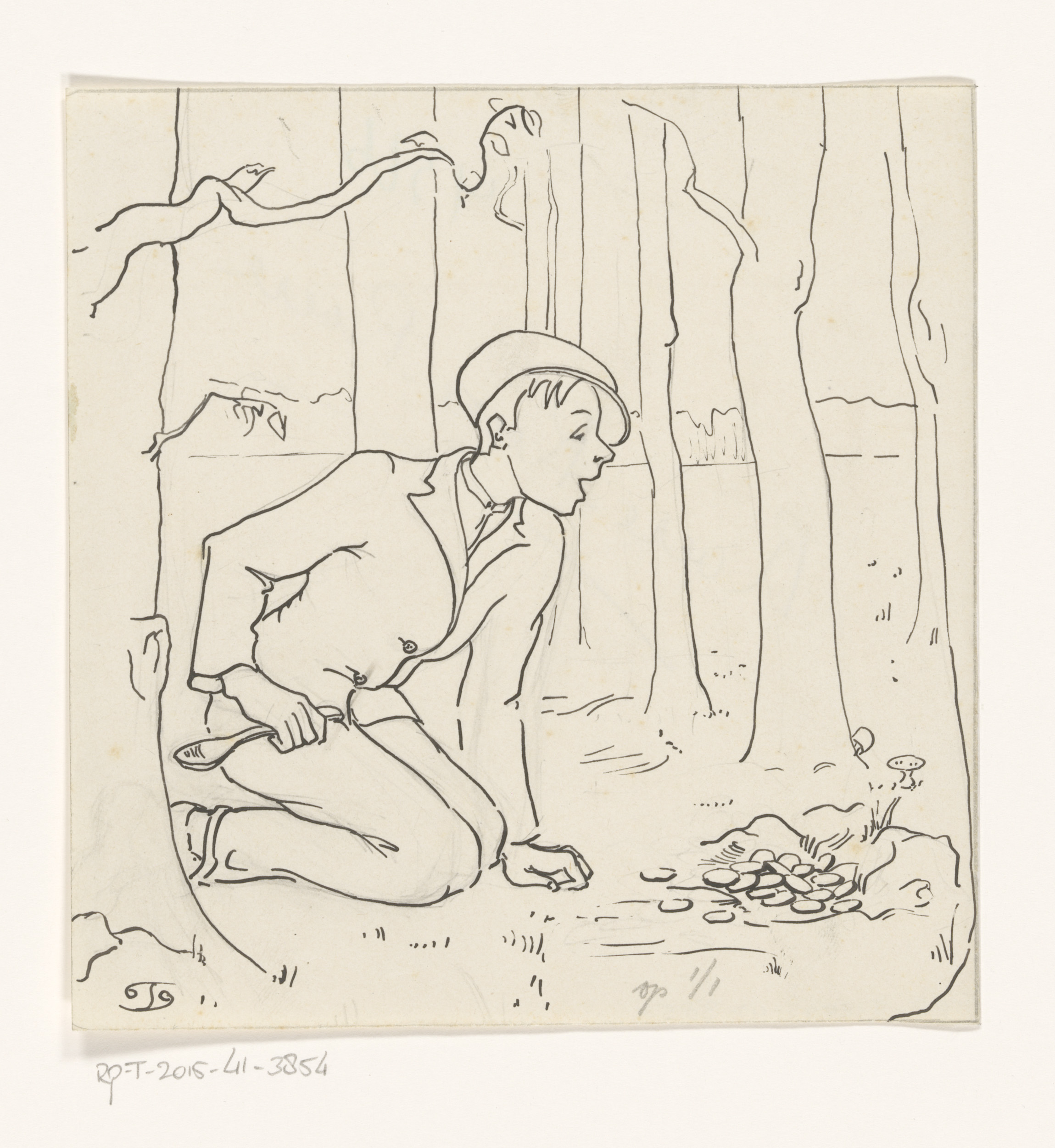 Jongen met lepel tussen de bomen