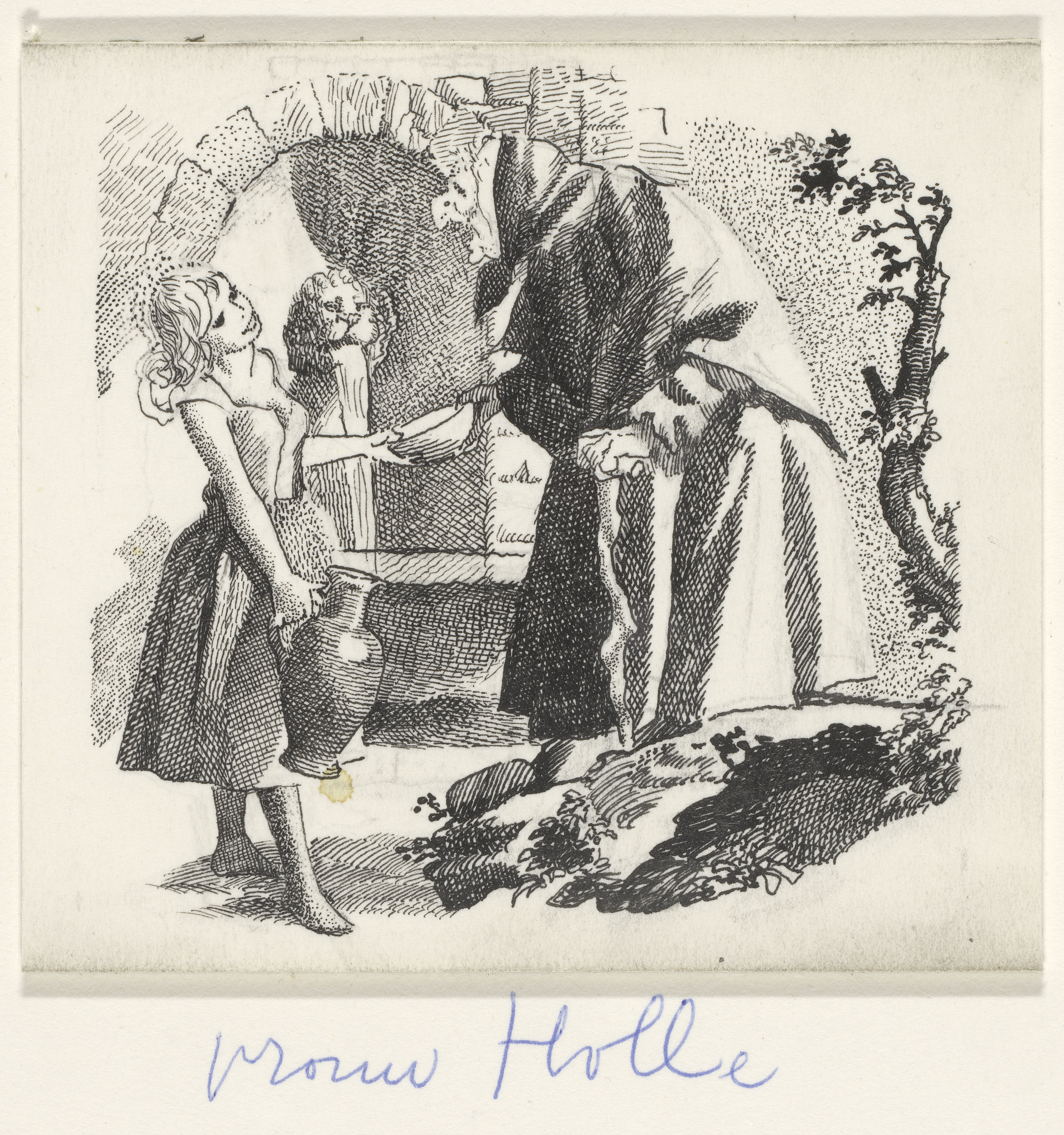 Vrouw Holle en een meisje met kruik en kom
