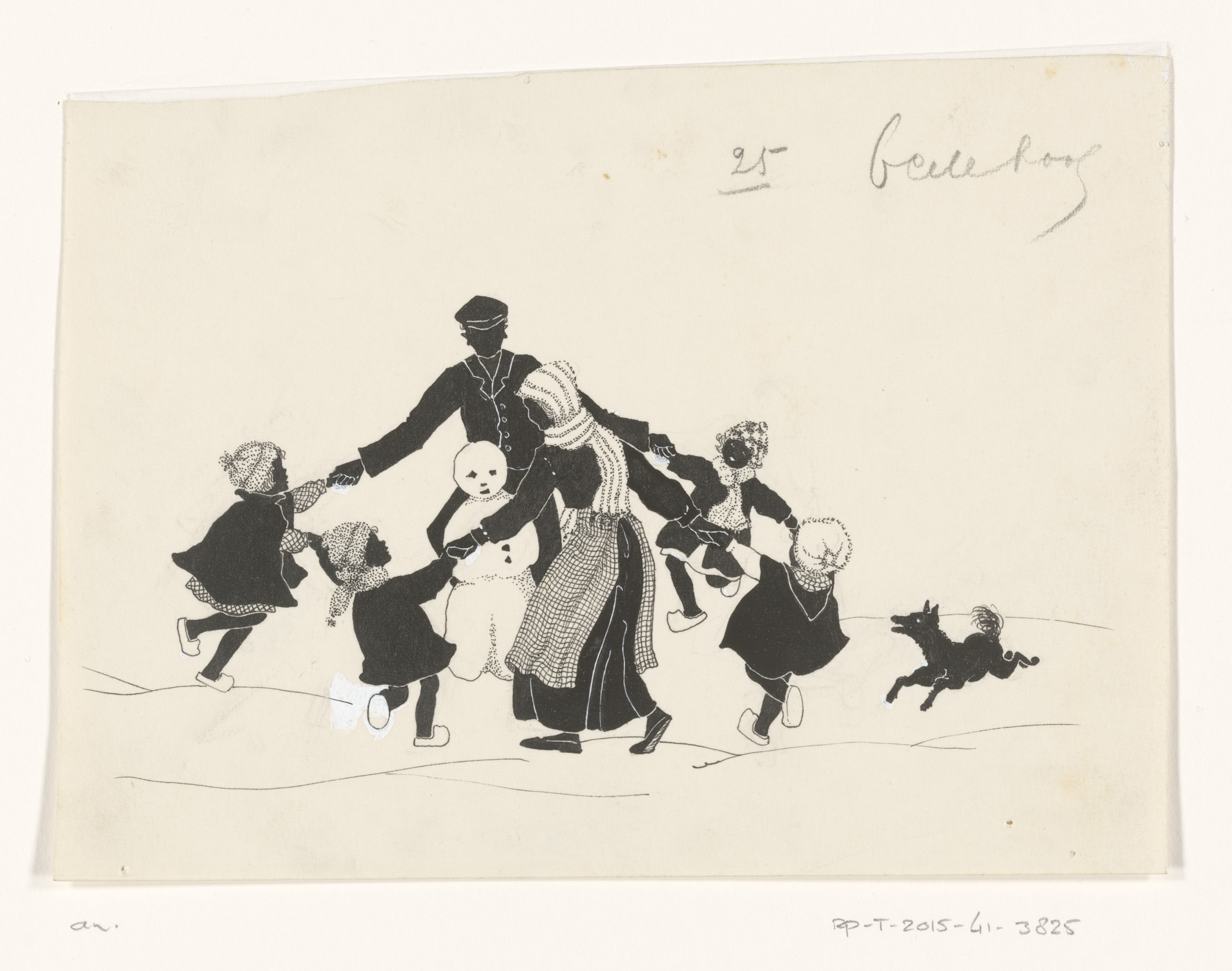 Man, vrouw en kinderen dansen in een kring rond een ...