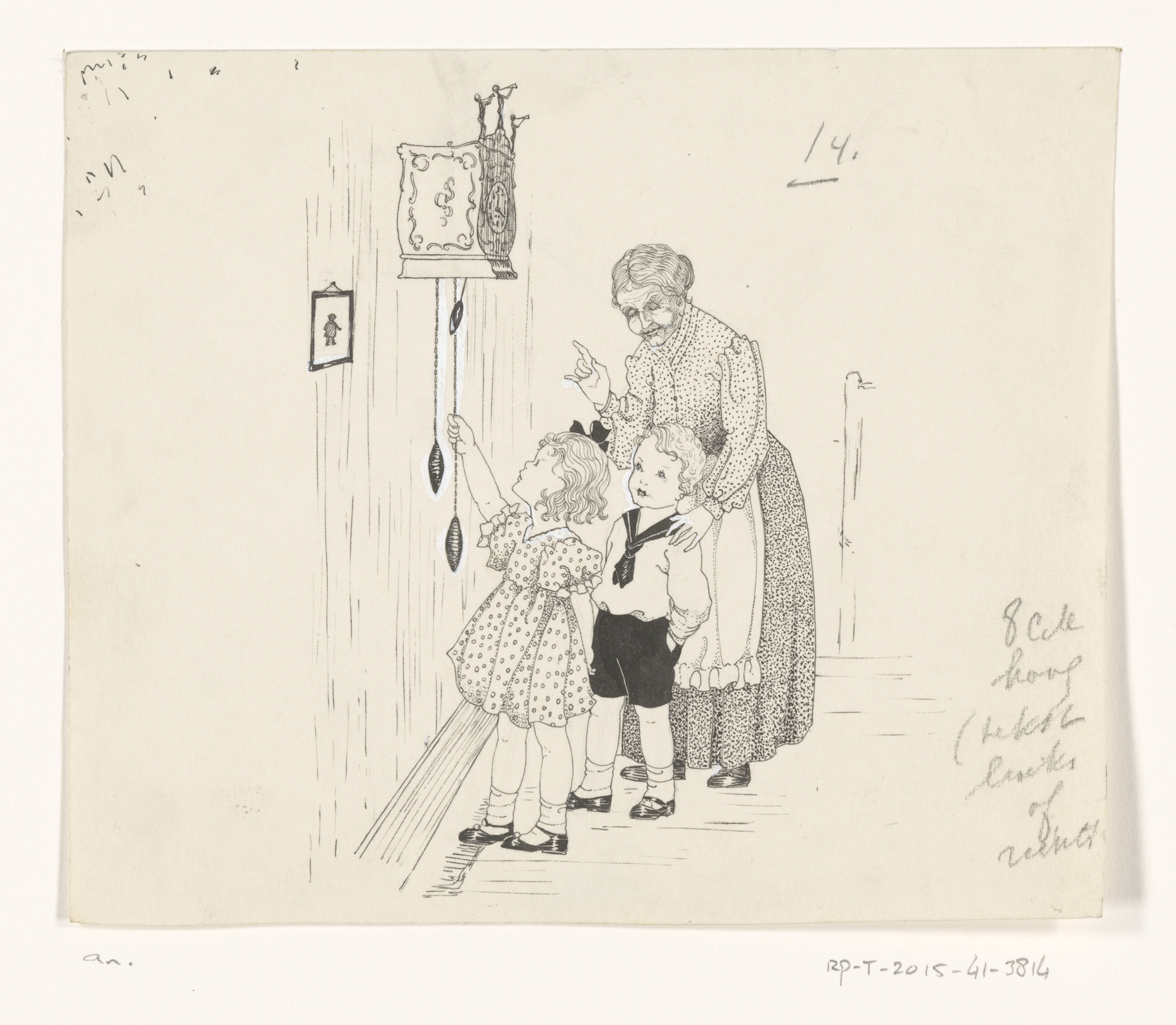 Oude vrouw en twee kinderen bij een klok