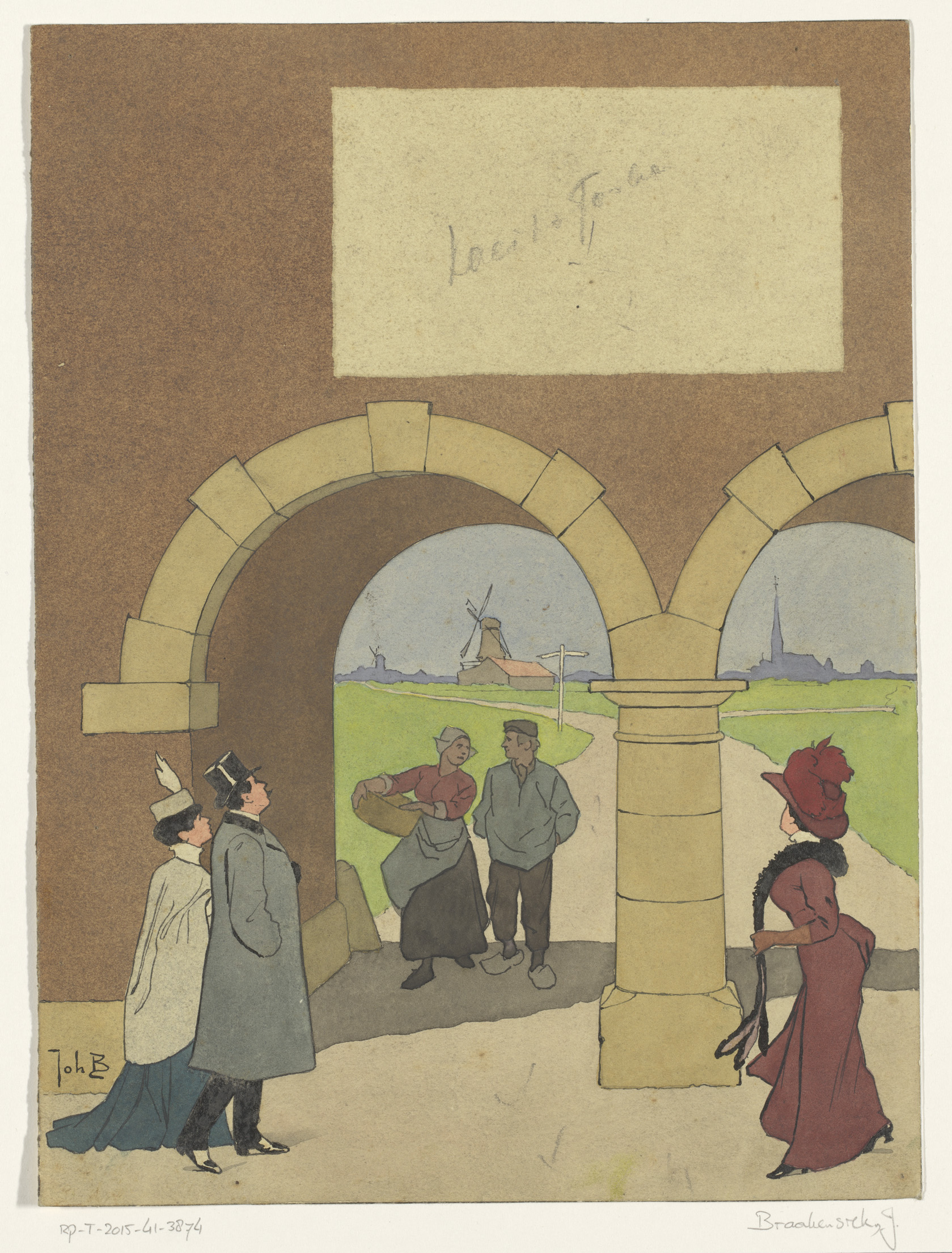 Bandontwerp met wandelaars bij een poortgebouw