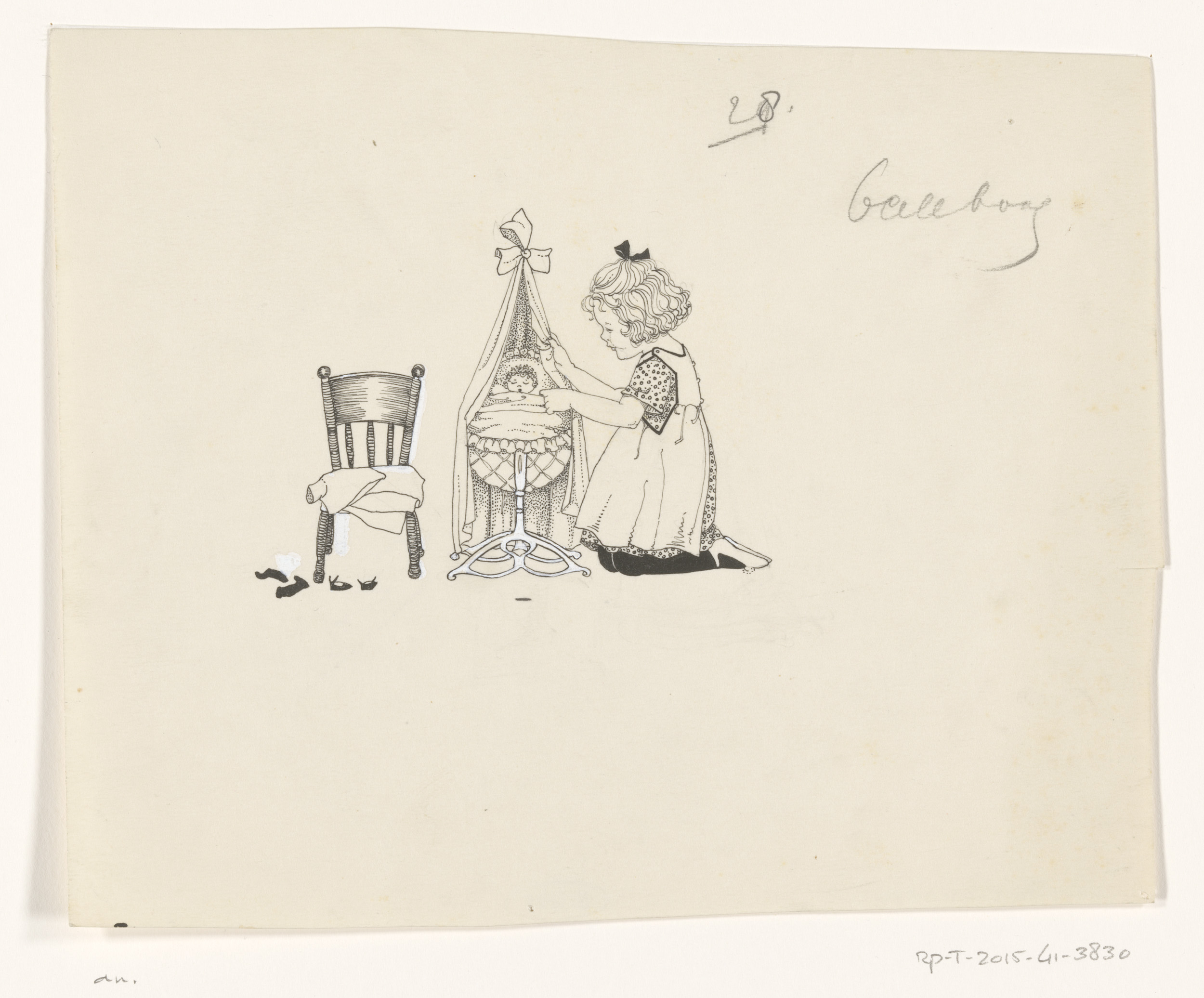 Knielend meisje bij een poppenwieg