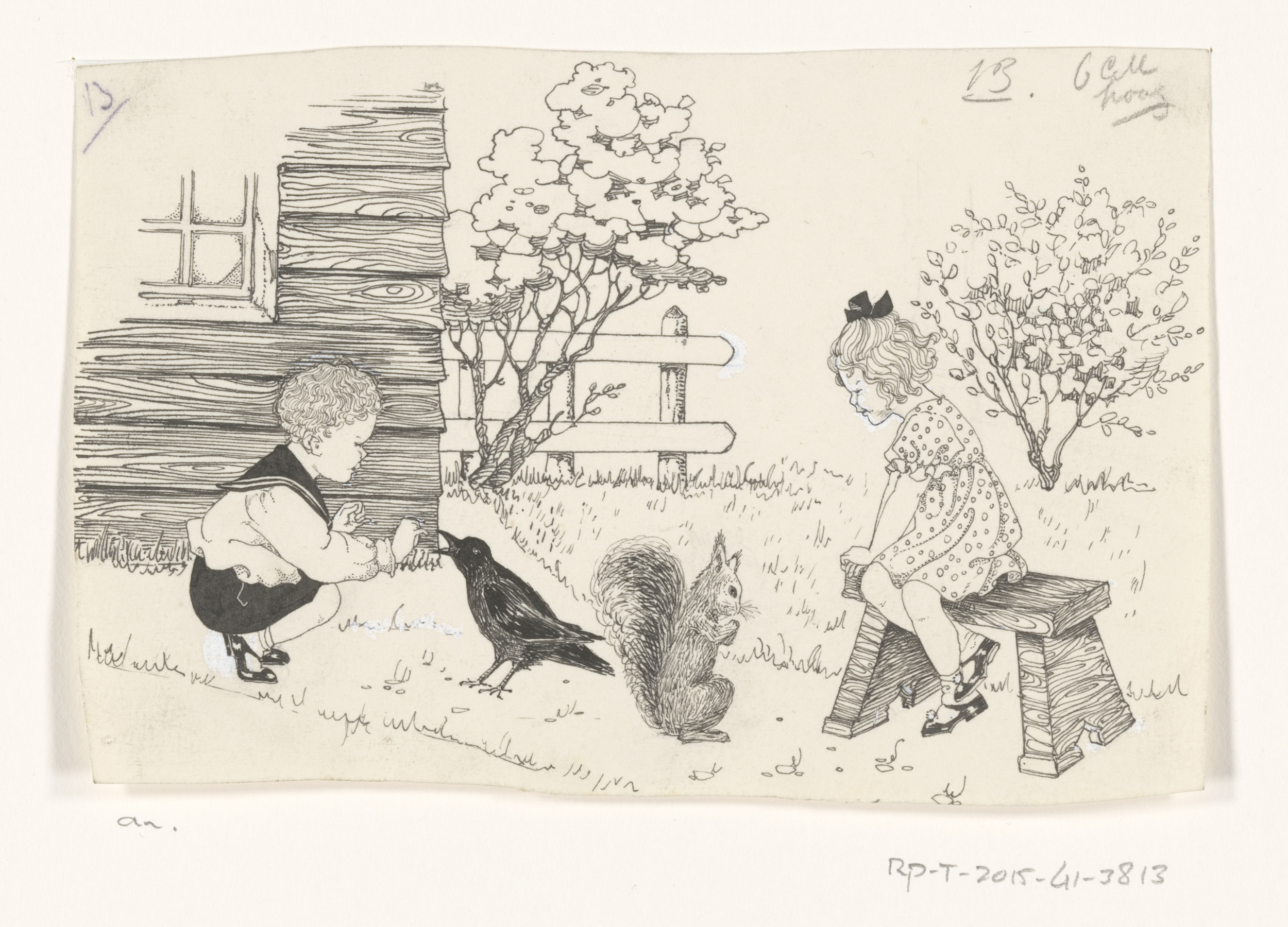 Jongen voert een spreeuw en meisje met eekhoorn
