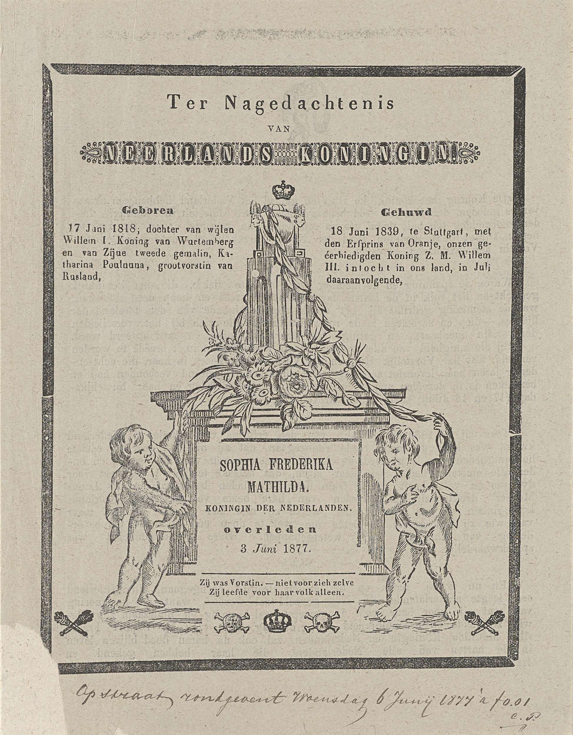 Blad ter nagedachtenis aan koningin Sophia, 1877