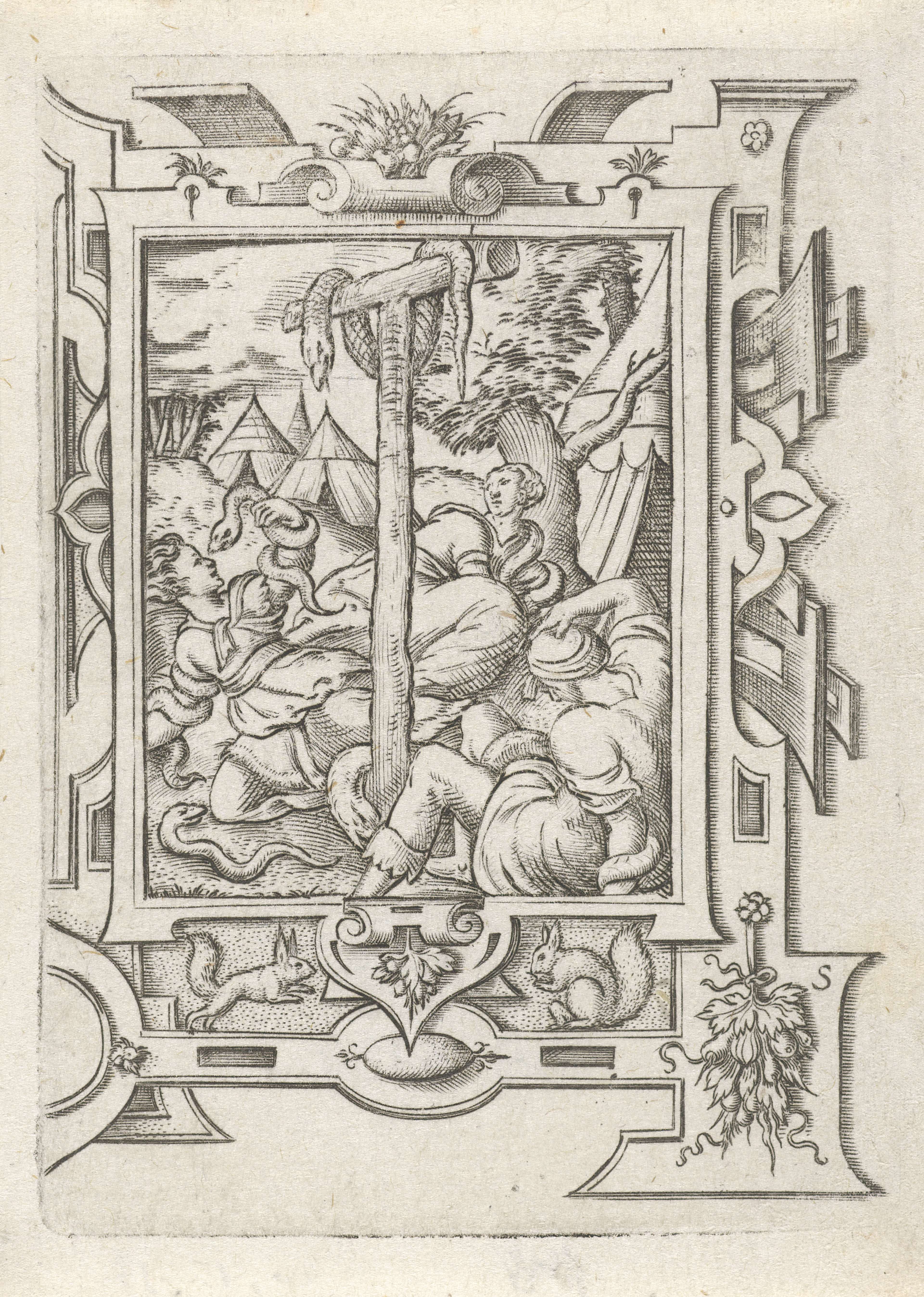 Drie cartouches met een landschap, soldaat en geblad...