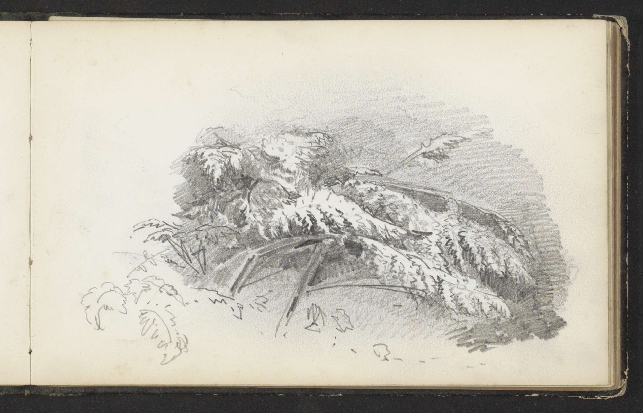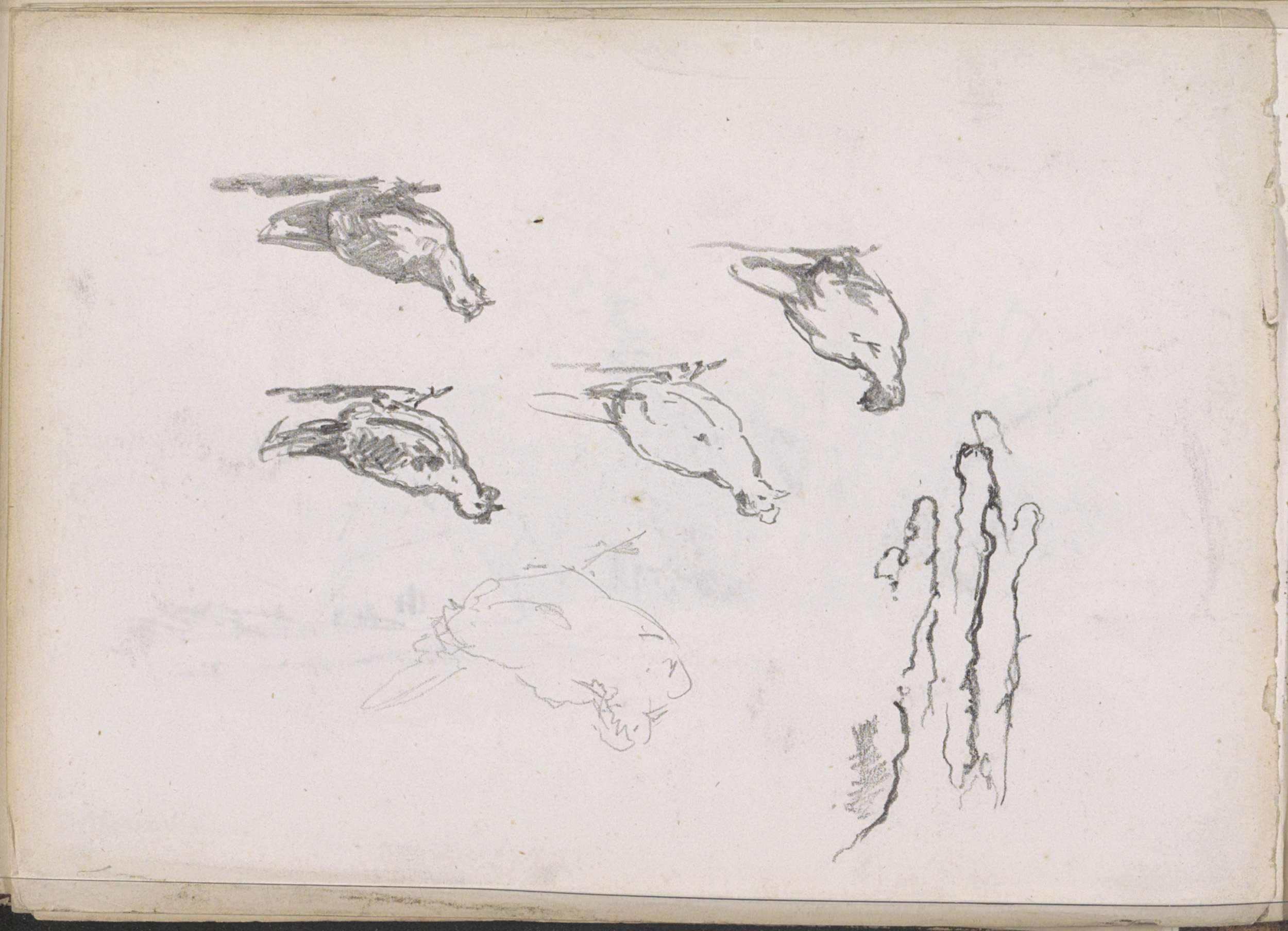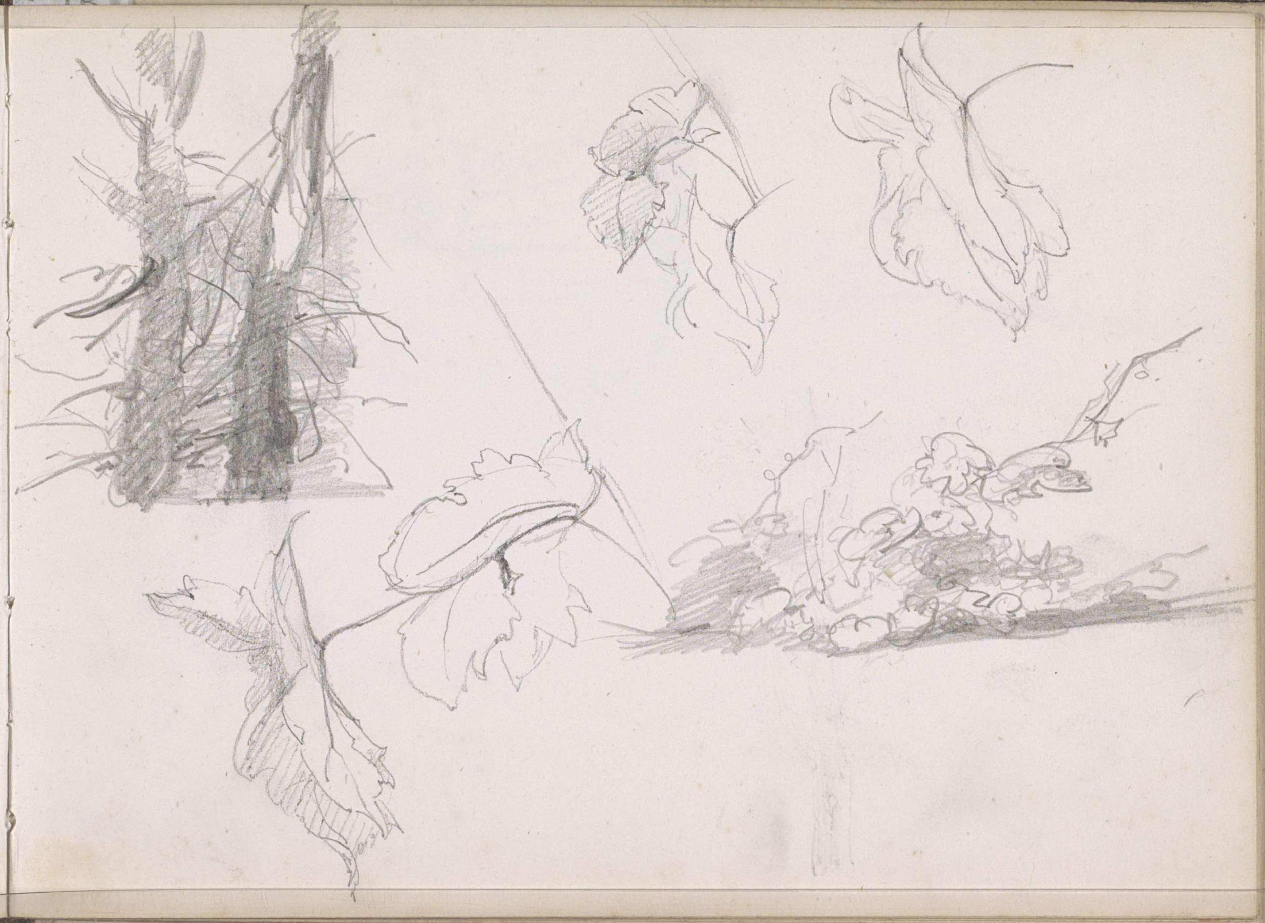 Duif, kelk en diverse voorwerpen bij een boomstam op...
